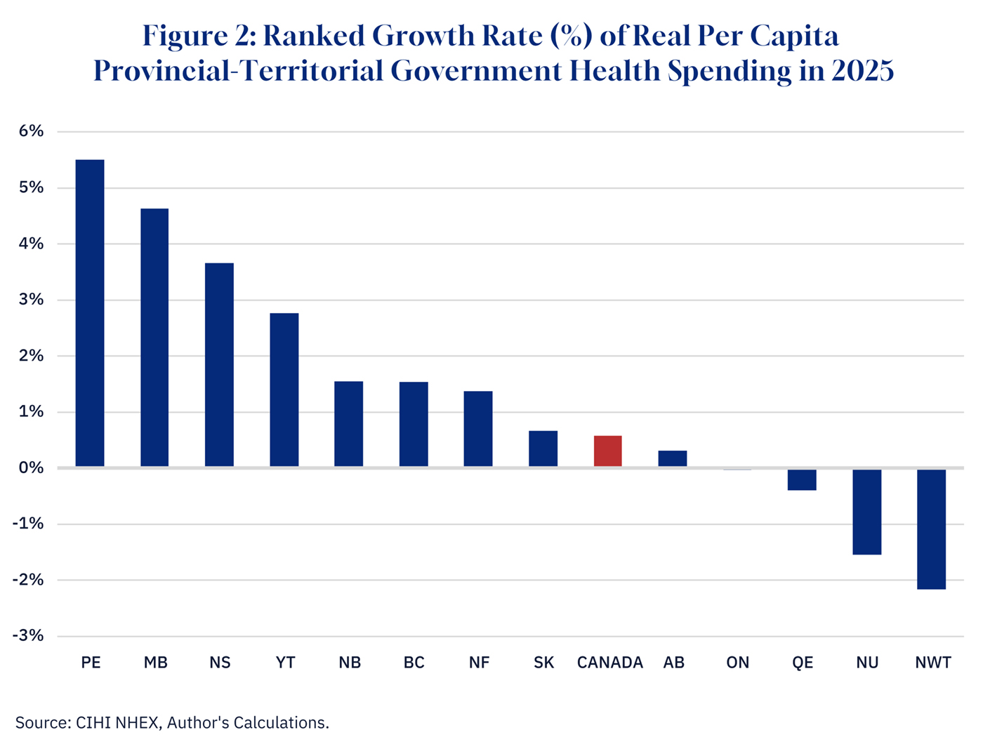 Over time, these differences can be aggravated by differences in growth, as illustrated in Figure 2, which presents the ranked growth rate of real per capita provincial-territorial government health spending in 2025. The fastest growth rates of total real per capita government health spending—all over 3 percent—were highest in Prince Edward Island, Manitoba, and Nova Scotia. At the bottom, experiencing varying degrees of negative growth, were Ontario, Quebec, Nunavut, and the Northwest Territories.