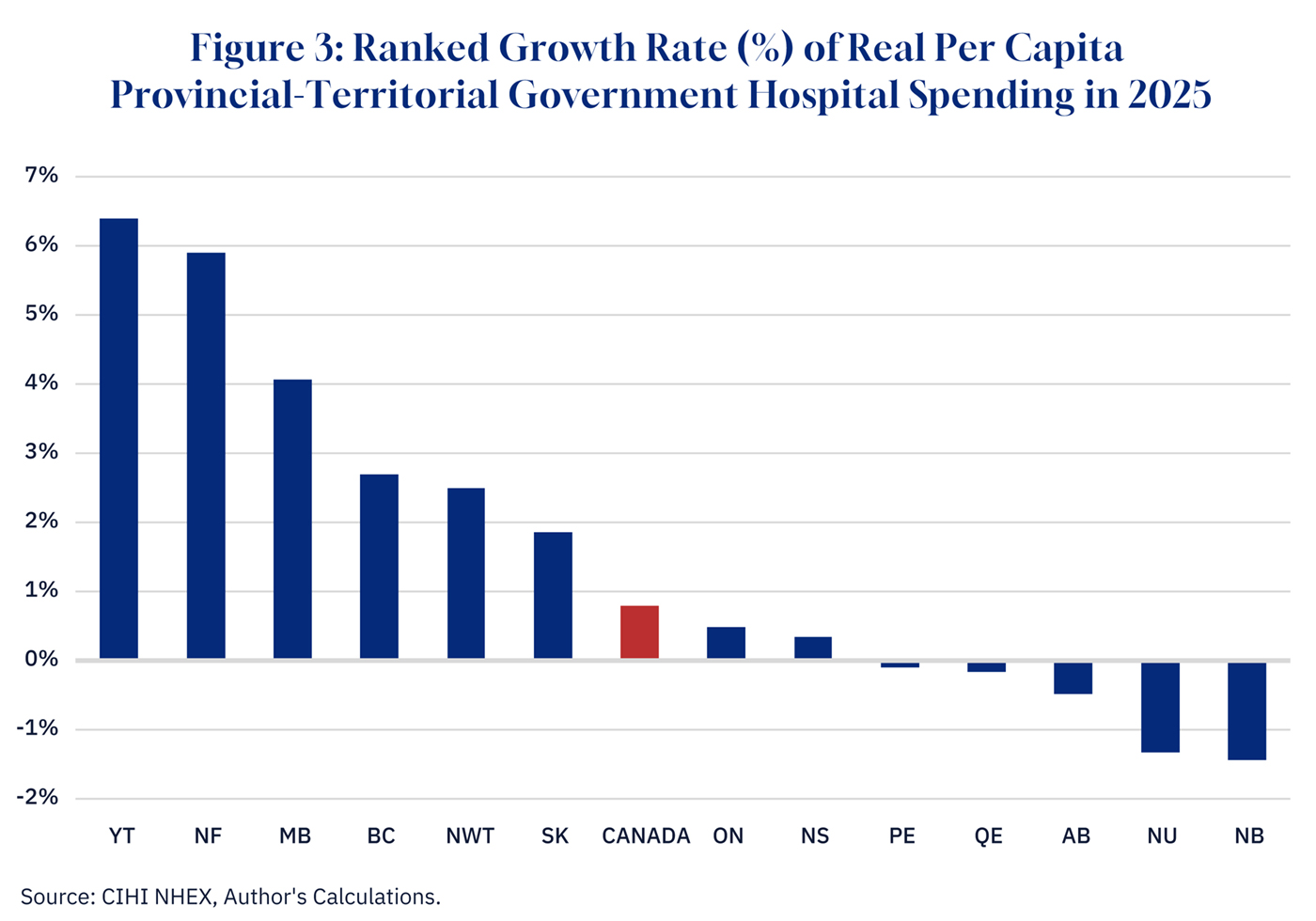 Real per capita provincial government hospital spending in 2025 was over 3 percent in the Yukon, Newfoundland and Labrador, and Manitoba. British Columbia, the Northwest Territories, and Saskatchewan followed above the 0.8 percent Canadian average. Ontario and Nova Scotia eked out increases of 0.5 and 0.3 percent, respectively, while all the remaining provinces and Nunavut saw negative growth, with New Brunswick bottoming at -1.4 percent.