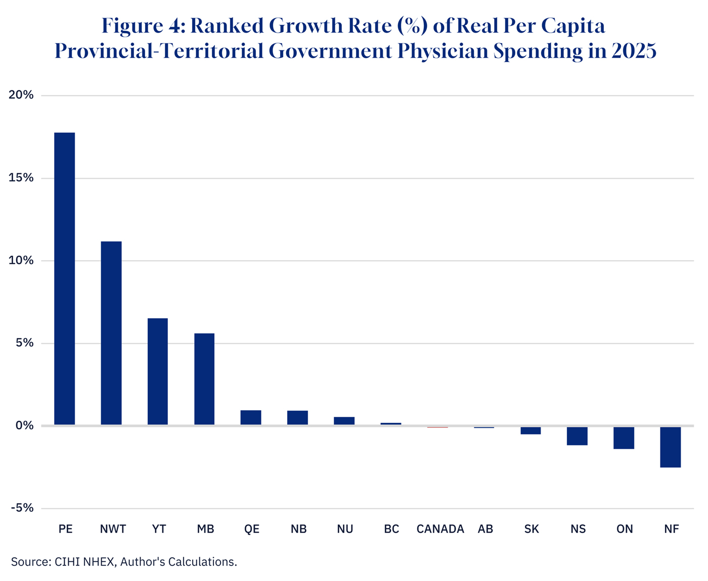 The differences in physician spending are more interesting. Prince Edward Island will see real per capita provincial government physician spending (in 2025 dollars) increase 17.8 percent in 2025. This comes on the heels of what appears to be a concerted effort to add net new physicians as retirements occur. Prince Edward Island is followed by the Northwest Territories, the Yukon, and Manitoba, which all saw growth of over 5 percent.