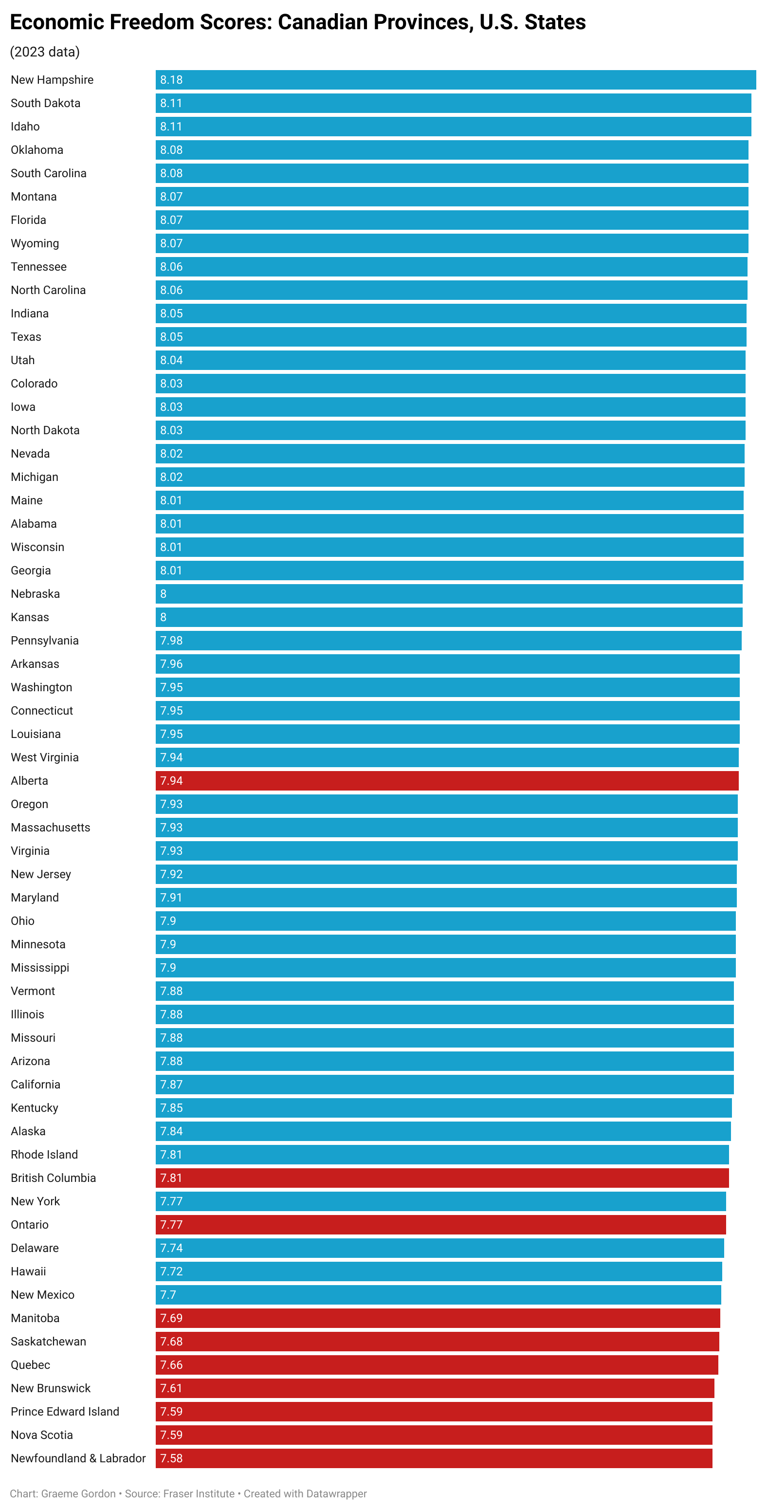 Seven provinces in Canada rank lower than all of the United States for economic freedom according to the Fraser Institute’s newly released annual research report.