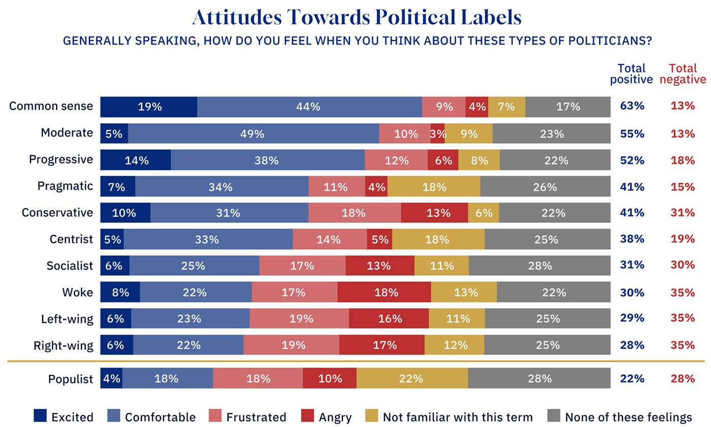 Negative reactions to populism are also comparatively muted. Combined feelings of “frustration” (18 percent) and “anger” (10 percent) yield a 28 percent total negative score, placing populism well below labels such as “woke” (35 percent negative), “left-wing” (35 percent), “right-wing” (35 percent), “conservative” (31 percent), and “socialist” (30 percent). These ideologically charged terms provoke sharper emotional backlash, particularly anger: “woke” politicians, for example, generate 18 percent anger, compared with just 10 percent for populists.