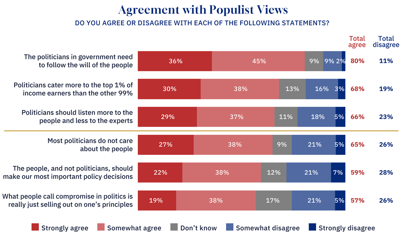 Yet this resistance to populism as a label contrasts sharply with widespread endorsement of populist democratic claims. Fully 80 percent of Canadians agree that “Politicians should follow the will of the people.” Sixty-eight percent believe “Politicians are overly influenced by the top 1 percent.” Two-thirds think “Politicians listen too much to experts and not enough to ordinary citizens,” while 65 percent believe “Politicians do not genuinely care about the public.” Nearly 60 percent say that “The people—and not politicians—should make the most important policy decisions,” and 57 percent regard compromise as a “form of selling out.”