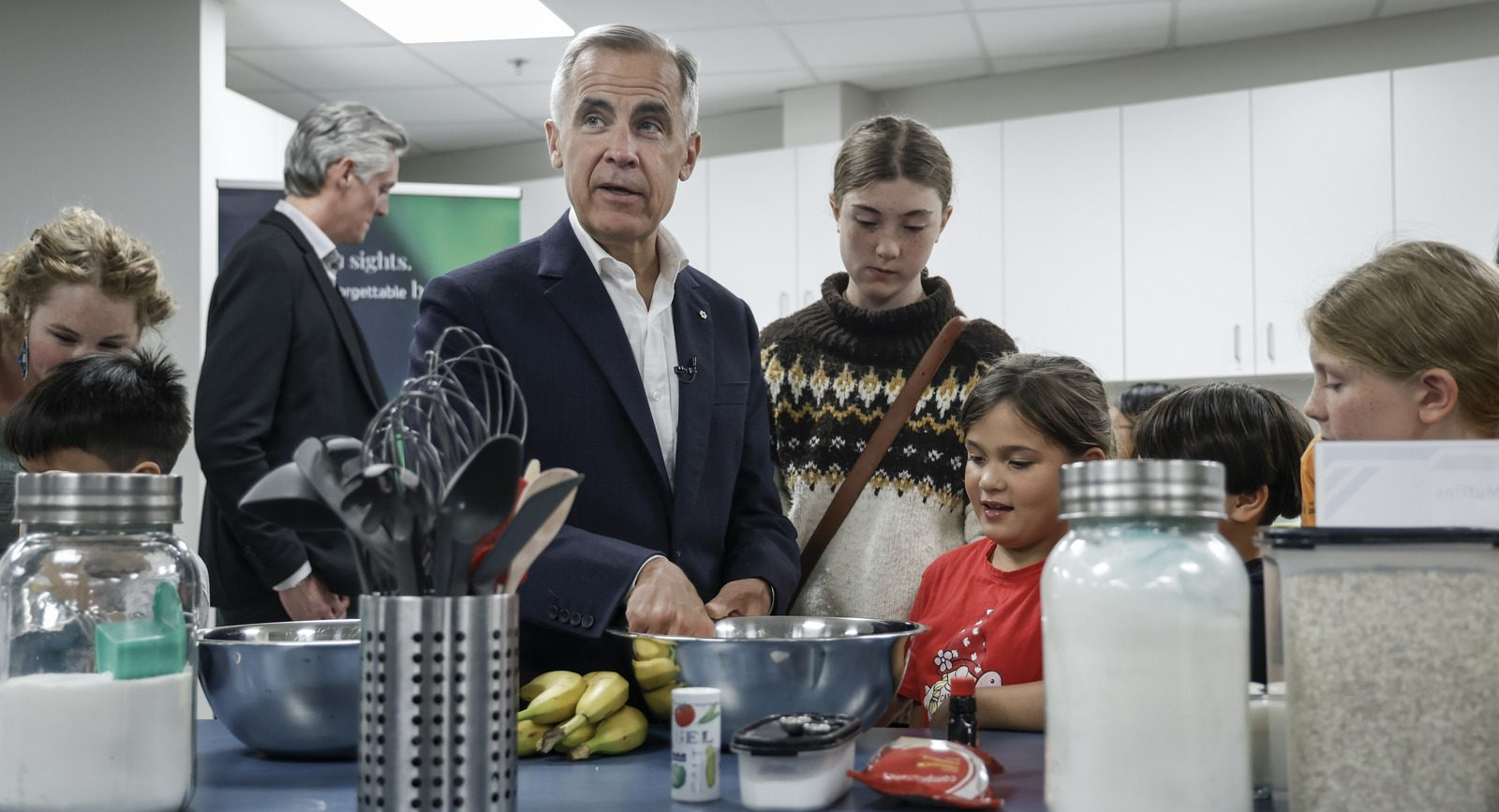 Prime Minister Mark Carney makes banana muffins with summer camp kids in Fort Smith, N.W.T., on July 23, 2025. Jeff McIntosh/The Canadian Press.