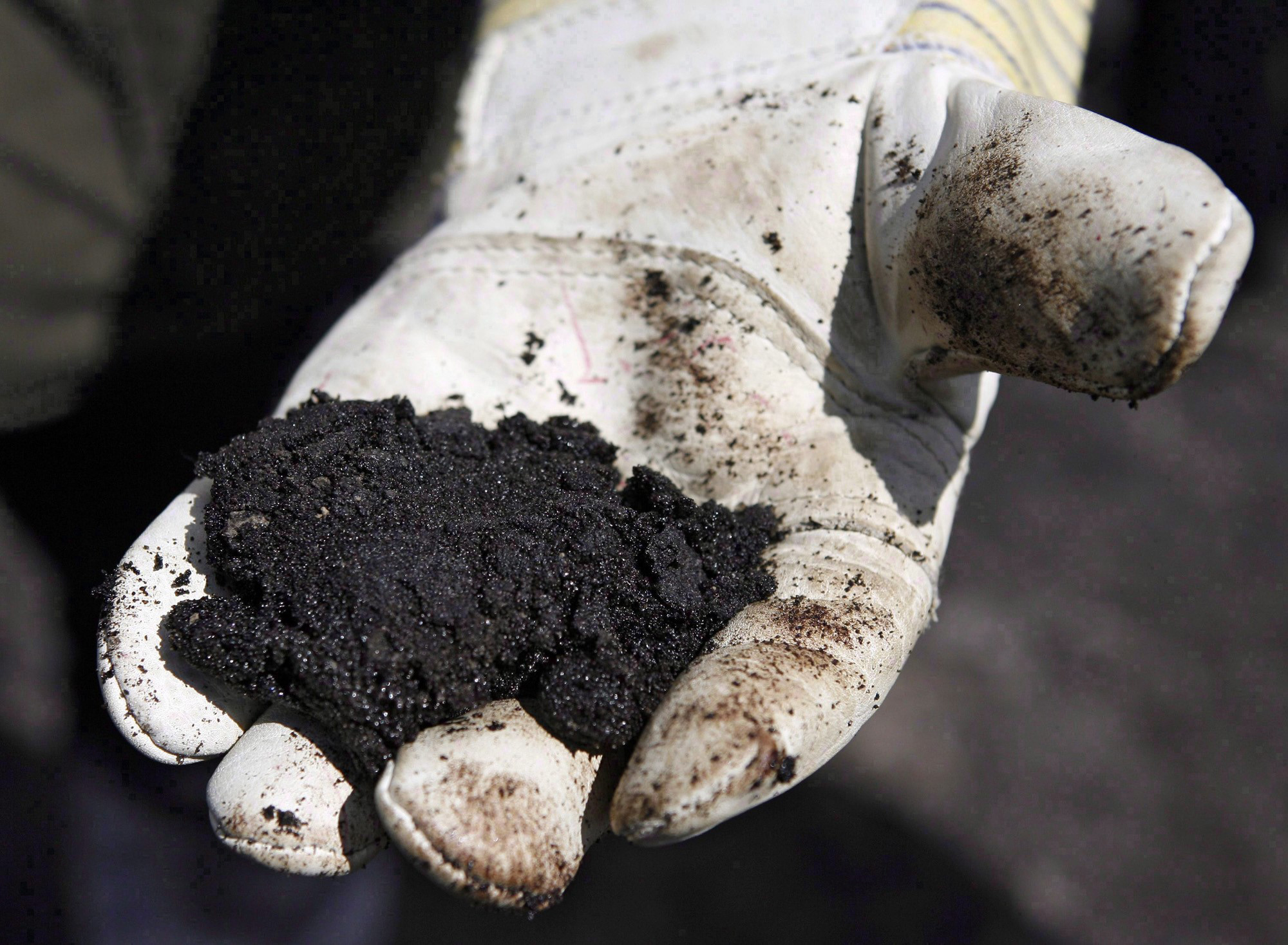 An oil worker holds raw sand bitumen near Fort McMurray, on July 9, 2008. Jeff McIntosh/The Canadian Press.
