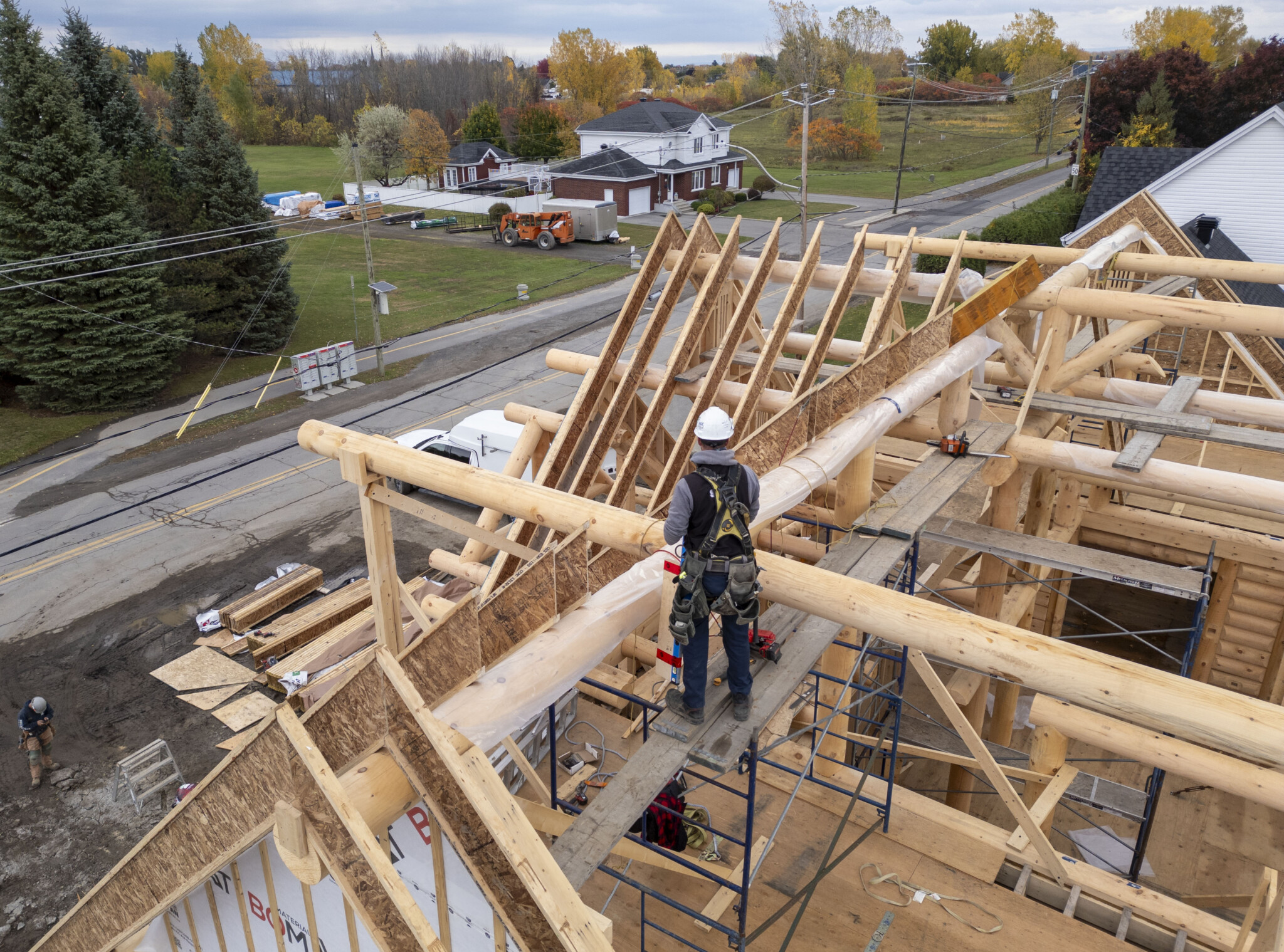 An aerial view shows carpenters building a log home made from white pine in Salaberry-de-Valleyfield, Que., on Wednesday, Oct. 22, 2025. Christinne Muschi/The Canadian Press.