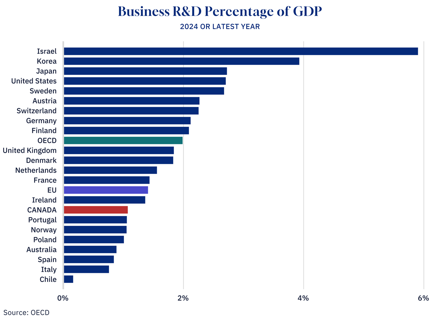 Canada’s business expenditure on research and development (BERD) intensity fell from about 77 percent of the OECD average in 2000 to just 57 percent in 2023. While our global peers race to compete in the knowledge economy, Canadian business R&D spending as a share of GDP sits at just 1.1 percent, well below the OECD average of 2.0 percent.
