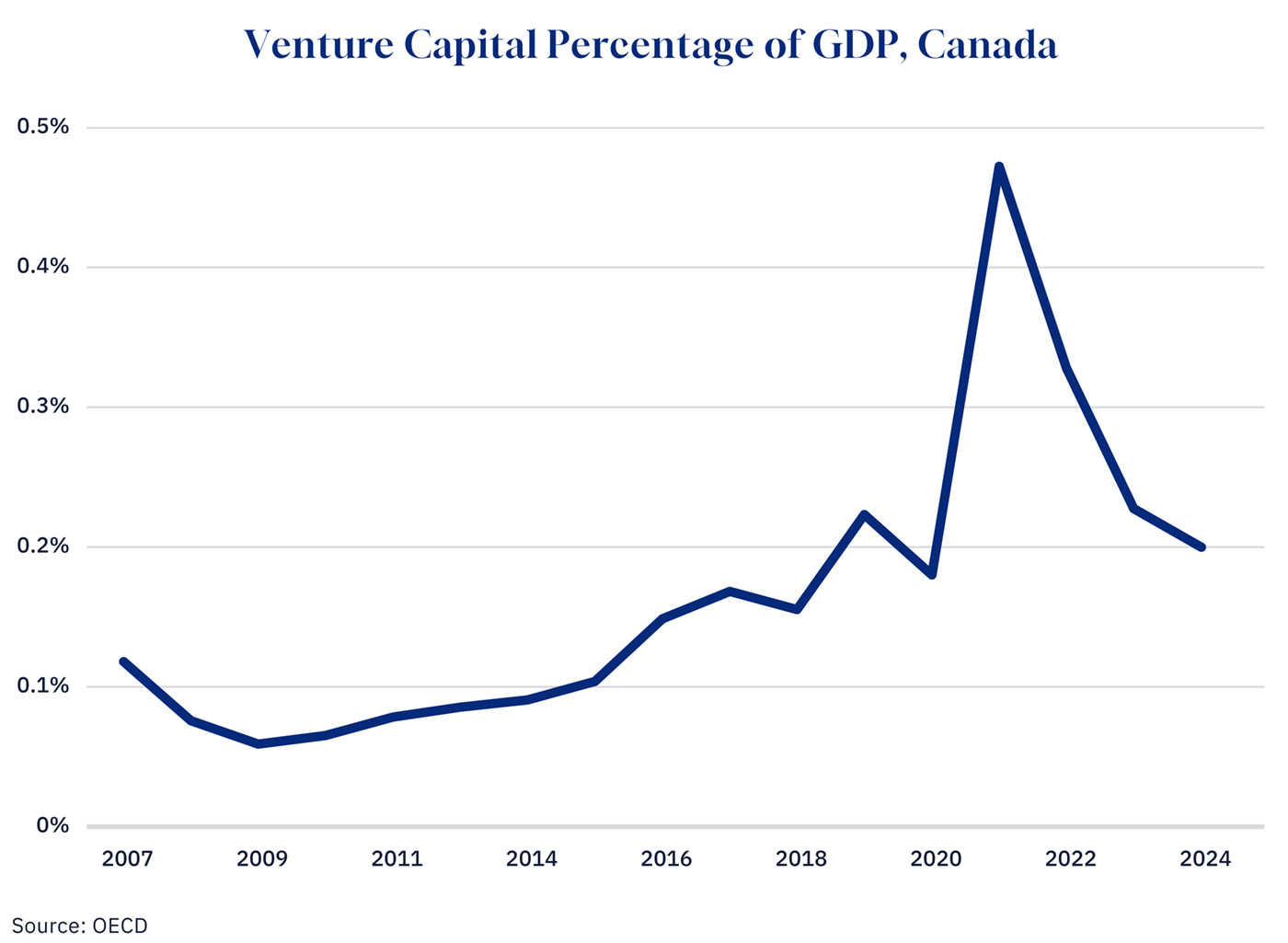 The venture capital landscape presents a more nuanced picture. On the surface, Canada’s venture capital investment as a share of GDP appears relatively strong at 0.2 percent in 2024, tying us for second with Estonia among OECD countries. Only the United States, at 0.86 percent of GDP, significantly outpaces Canada among large developed economies.