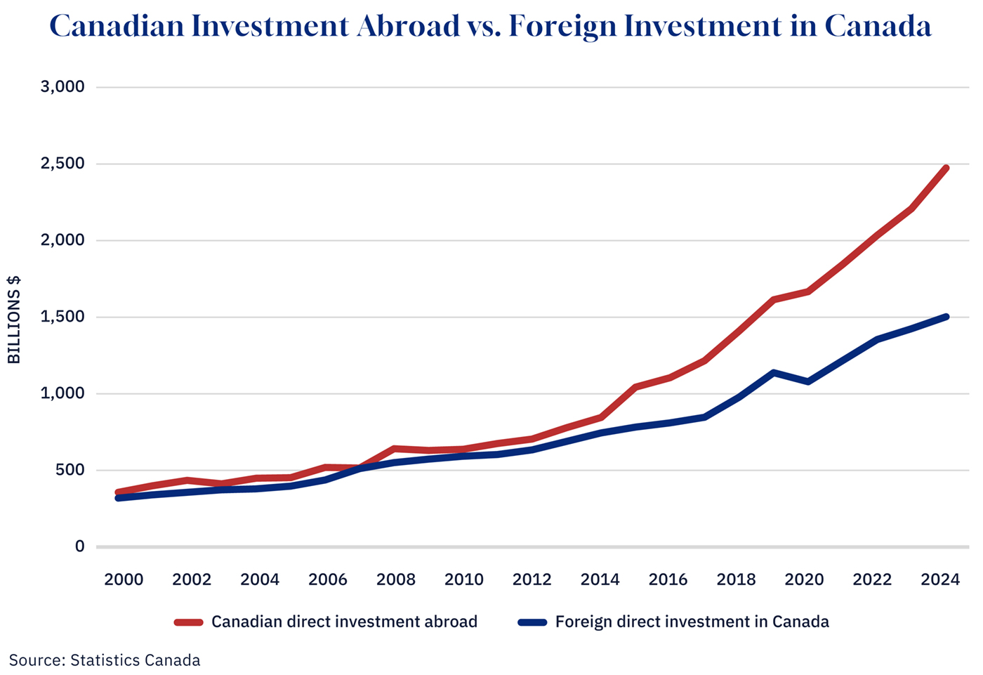 If Canada were a magnet for global capital, foreign assets here would rival or exceed our investments abroad. Instead, the numbers reveal a structural exodus. While foreign investment in Canada grew from approximately $320 billion in 2000 to $1.3 trillion in 2024, Canadian direct investment abroad surged from roughly $360 billion to $2.3 trillion.