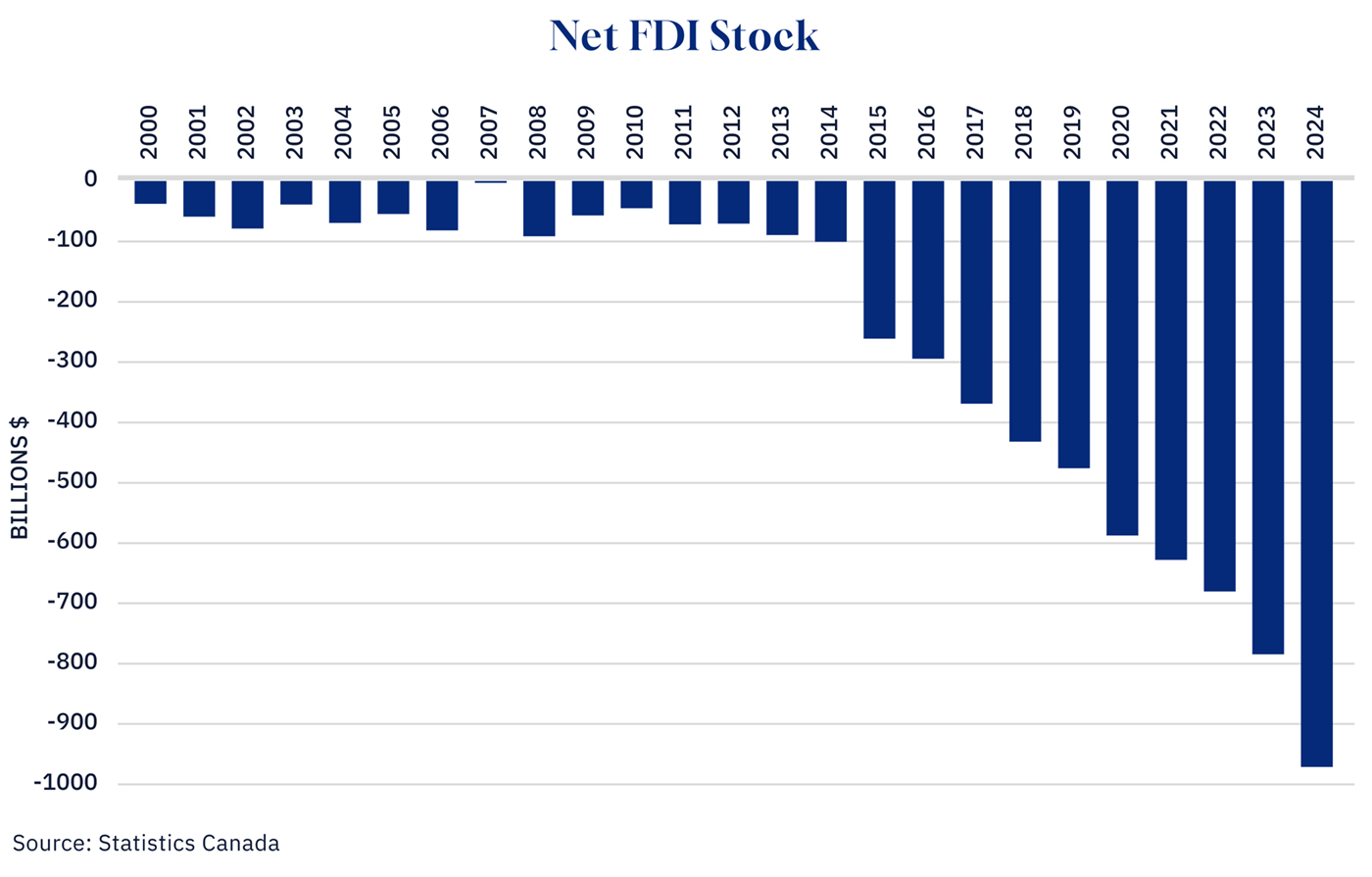 The gap has widened dramatically since 2014. We have become a massive net exporter of capital. As of 2024, our net FDI stock position stands at roughly negative $1 trillion—ironically, the government’s target for new investment.