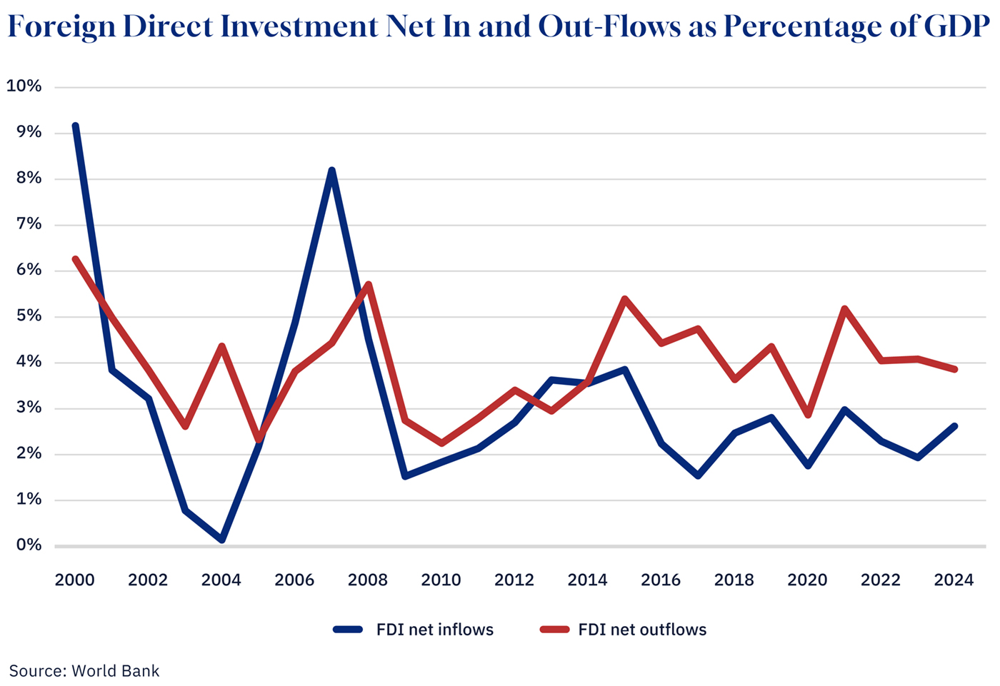 Since 2014, net FDI outflows have consistently outpaced inflows. In 2024, outflows hovered near 4 percent of GDP, while inflows barely exceeded 2.5 percent. The prime minister’s sales pitch is essential, but it fights a current that has been flowing against us for 10 years.