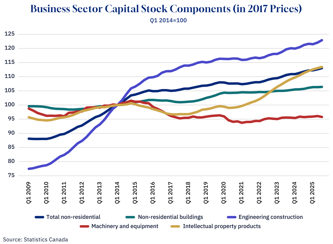 The business sector capital stock reveals a crisis in our industrial capacity. Between Q1 2014 and Q1 2024, total non-residential capital stock (measured in constant 2017 prices) grew by just 10.9 percent over the entire decade.