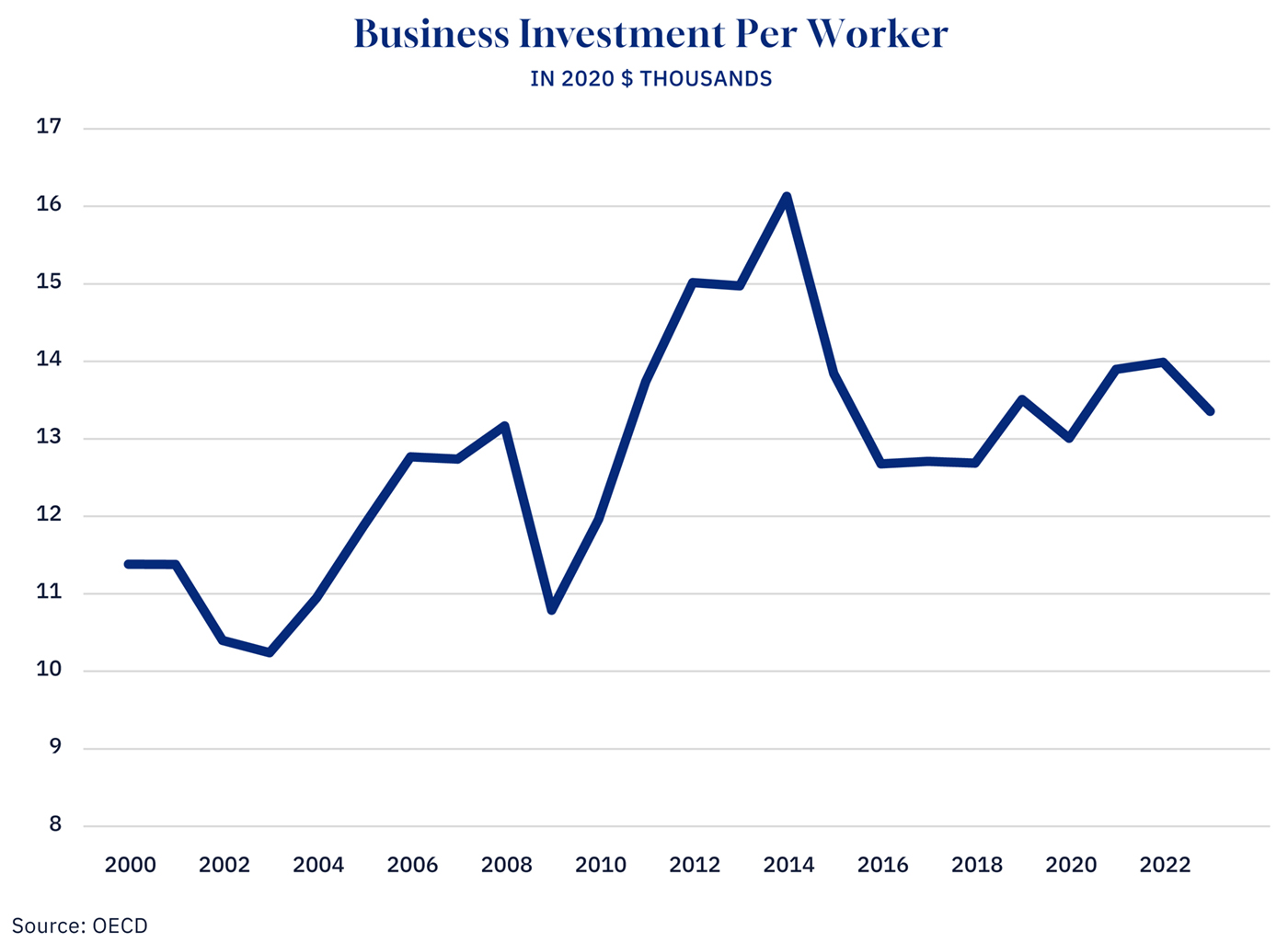The reliable path to higher wages is higher productivity. But in Canada, we are asking our workforce to do more with less. Since peaking in 2014 at approximately $16,100 per worker (in 2020 dollars), business investment per worker has been on a persistent downward slide, falling to roughly $13,400 by 2023.