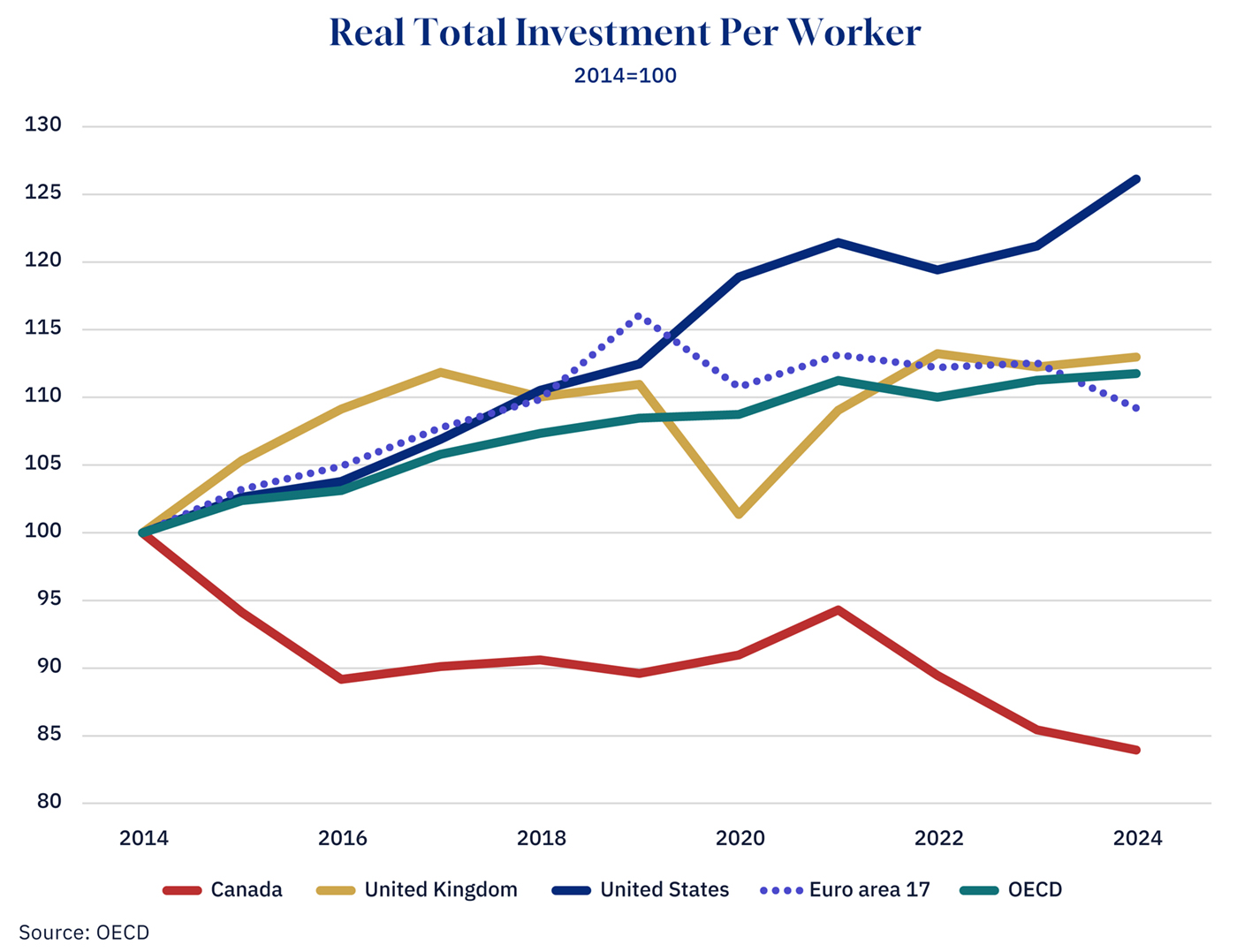The gap becomes starker when examining total investment per worker across countries. As Canada’s real total investment per worker has collapsed by 16 percent since 2014, over the same period, the United States has seen investment per worker rise by more than 26 percent. The gap between Canadian and American workers is widening, along with workers in the United Kingdom, the Euro area, and the broader OECD.