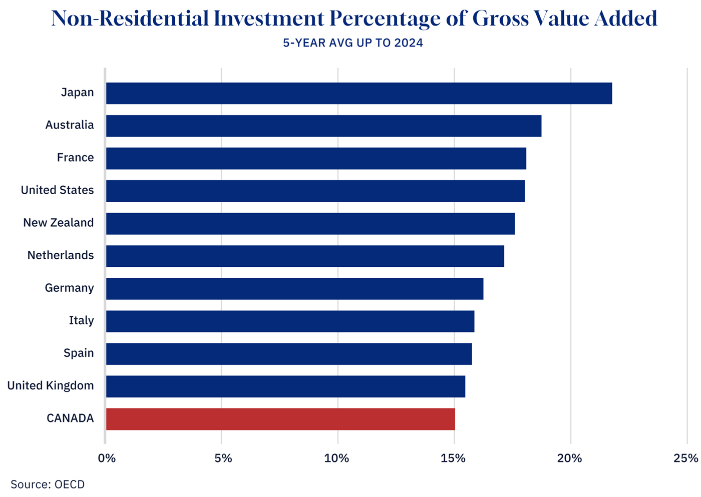 Based on the five-year average up to 2024, Canada is investing just 15 percent of its gross value added in non-residential assets. Compare that to the United States at 18 percent, Australia at 18.7 percent, and Japan at 21.8 percent. We also trail France, New Zealand, and the Netherlands.