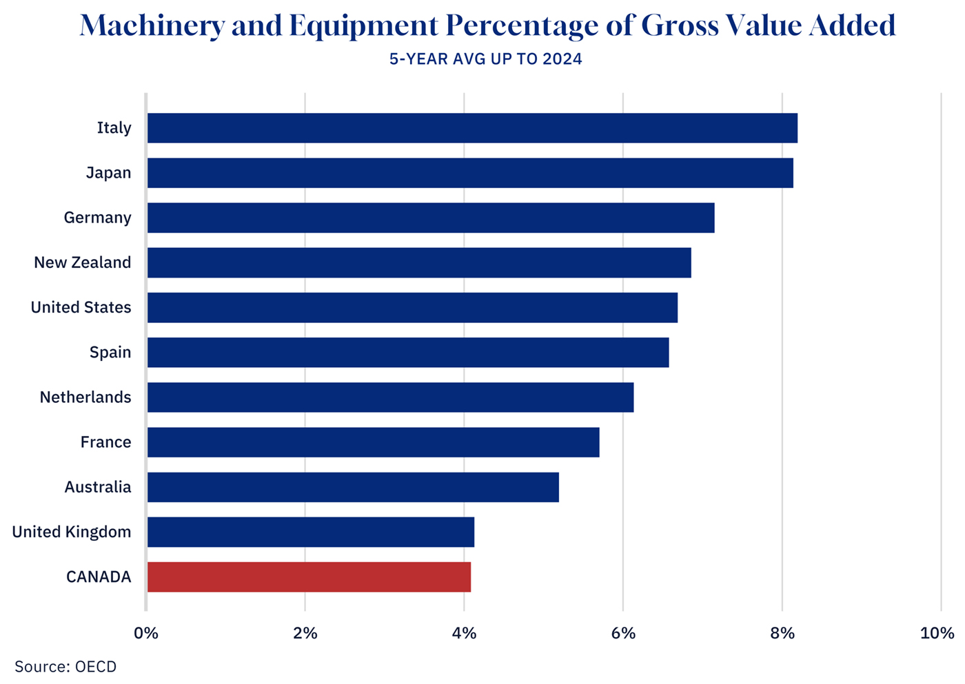 The composition of that investment is equally concerning. Canada invests just 4.1 percent of gross value added in machinery and equipment, placing us at the bottom of our peer group and well below the United States (6.7 percent), and leaders Japan and Italy (both over 8 percent).