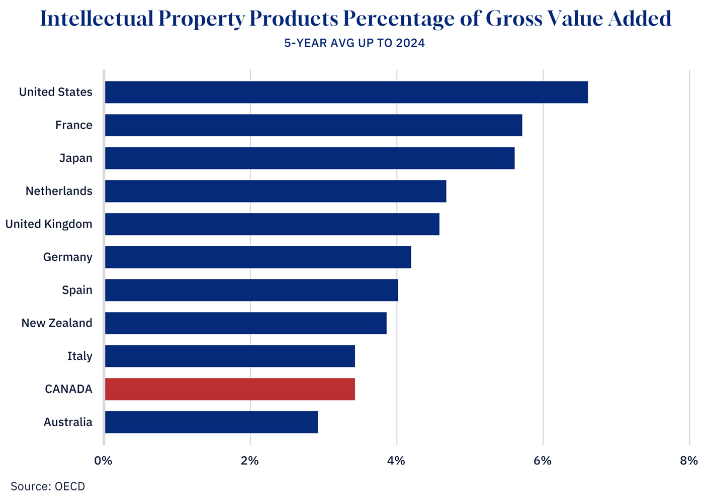 In intellectual property products (the software, patents, and R&D that define competitiveness in the modern economy), Canada invests just 3.4 percent of its gross value added, roughly half the American rate of 6.6 percent. We are trying to compete in an innovation economy while under-investing in the very assets that define it.