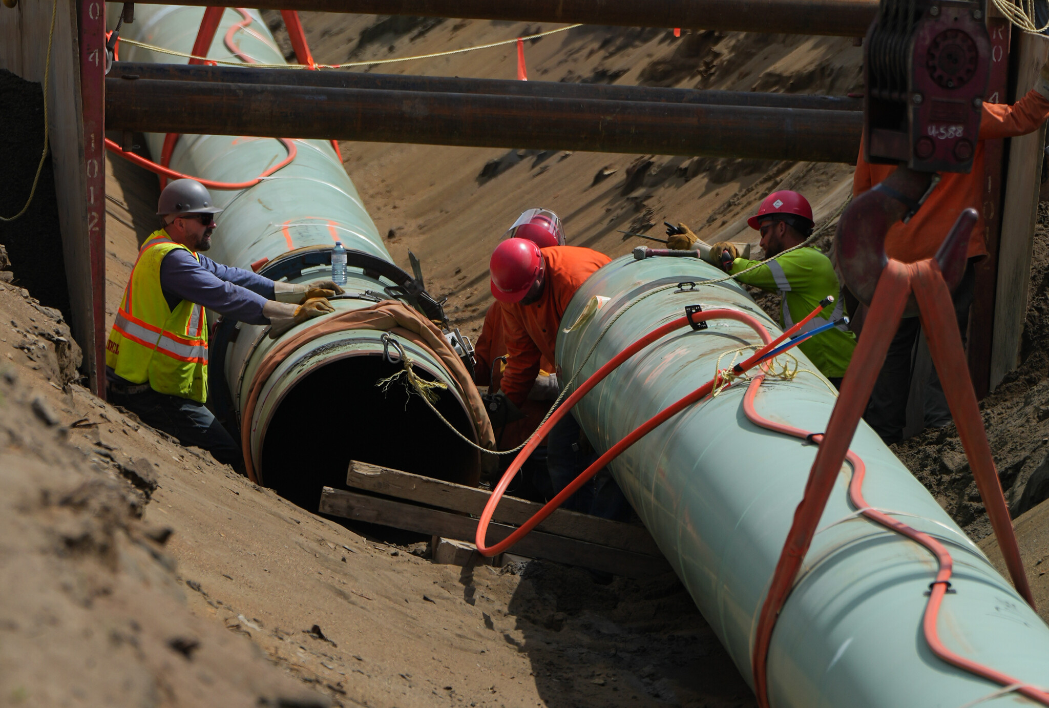 Workers lay pipe during construction of the Trans Mountain pipeline expansion on farmland, in Abbotsford, B.C., on Wednesday, May 3, 2023. Darryl Dyck/The Canadian Press.
