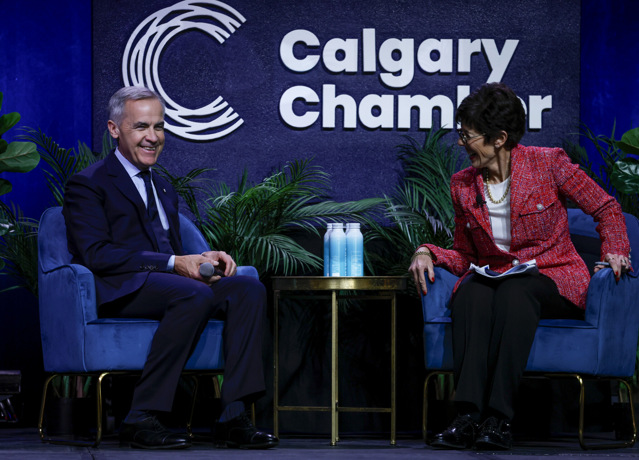 Prime Minister Mark Carney, left, speaks with Calgary Chamber of Commerce president Deborah Yedlin in Calgary, Alta., Thursday, Nov. 27, 2025. Jeff McIntosh/The Canadian Press.
