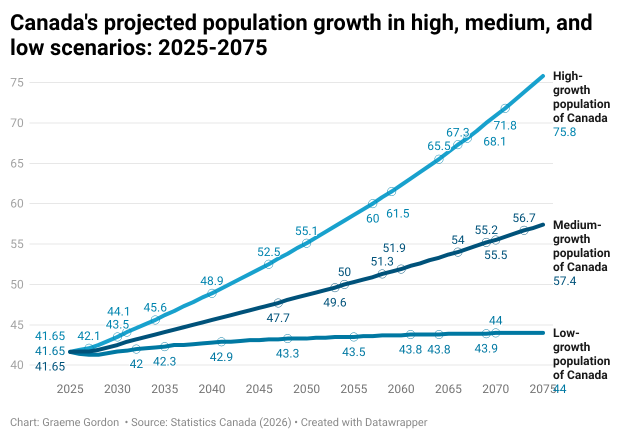 Starting from an estimated population of 41.7 million as of July 2025, Canada’s demographic trajectory diverges significantly depending on which scenario materializes. The medium-growth scenario, generally treated by demographers as the central reference point, projects a population of 57.4 million by 2075—an increase of 37.8 percent. The low-growth scenario projects only modest growth, to about 44 million—a 5.6 percent.