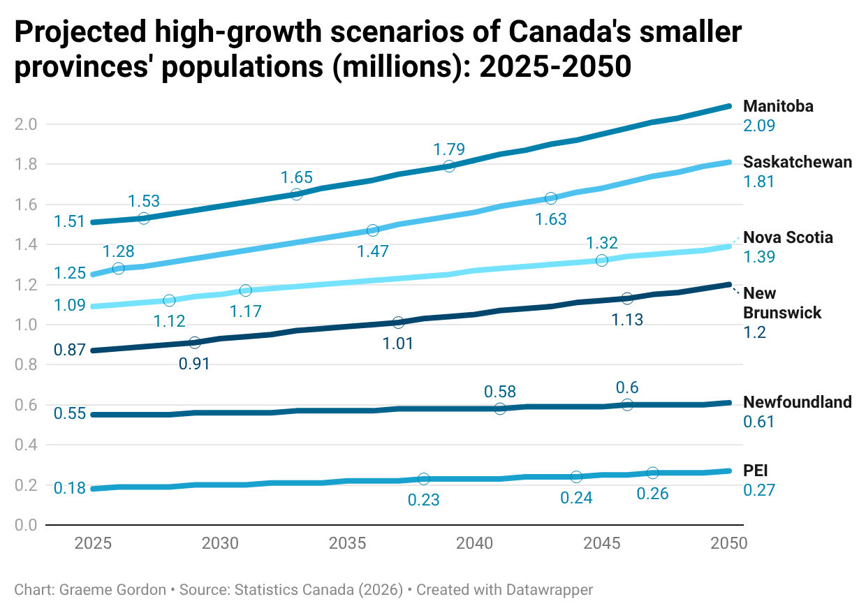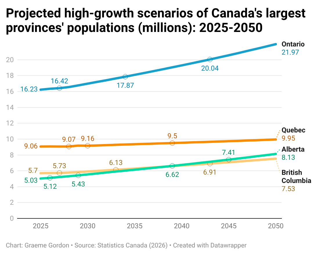 By contrast, Newfoundland and Labrador, Nova Scotia, and Quebec are projected to experience relative demographic decline. Quebec’s share of the national population, estimated at 21.7 percent in 2025, would fall to between 18.1 percent and 19.1 percent by 2050. Alberta’s share would rise from 12.1 percent to as high as 16.1 percent over the same period.
