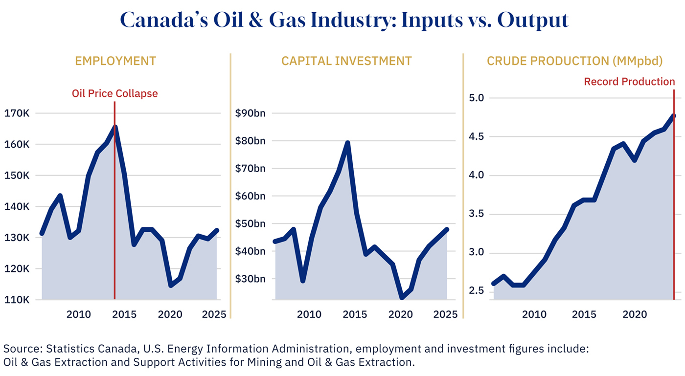 That’s not just concerning for the energy sector, it also doesn’t bode well for Prime Minister Carney’s investment ambitions. Reaching his goal of $1 trillion in new capital investment over the next five years, including $500 billion in net new private investment, will be a tall order if Canada’s energy sector is on the sidelines.