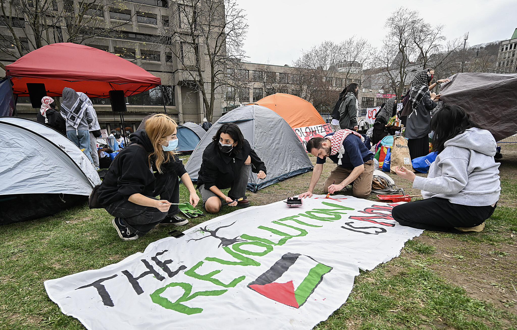 People work on a sign during a pro-Palestinian demonstration at an encampment at McGill University in Montreal on April 27, 2024. Graham Hughes/The Canadian Press.
