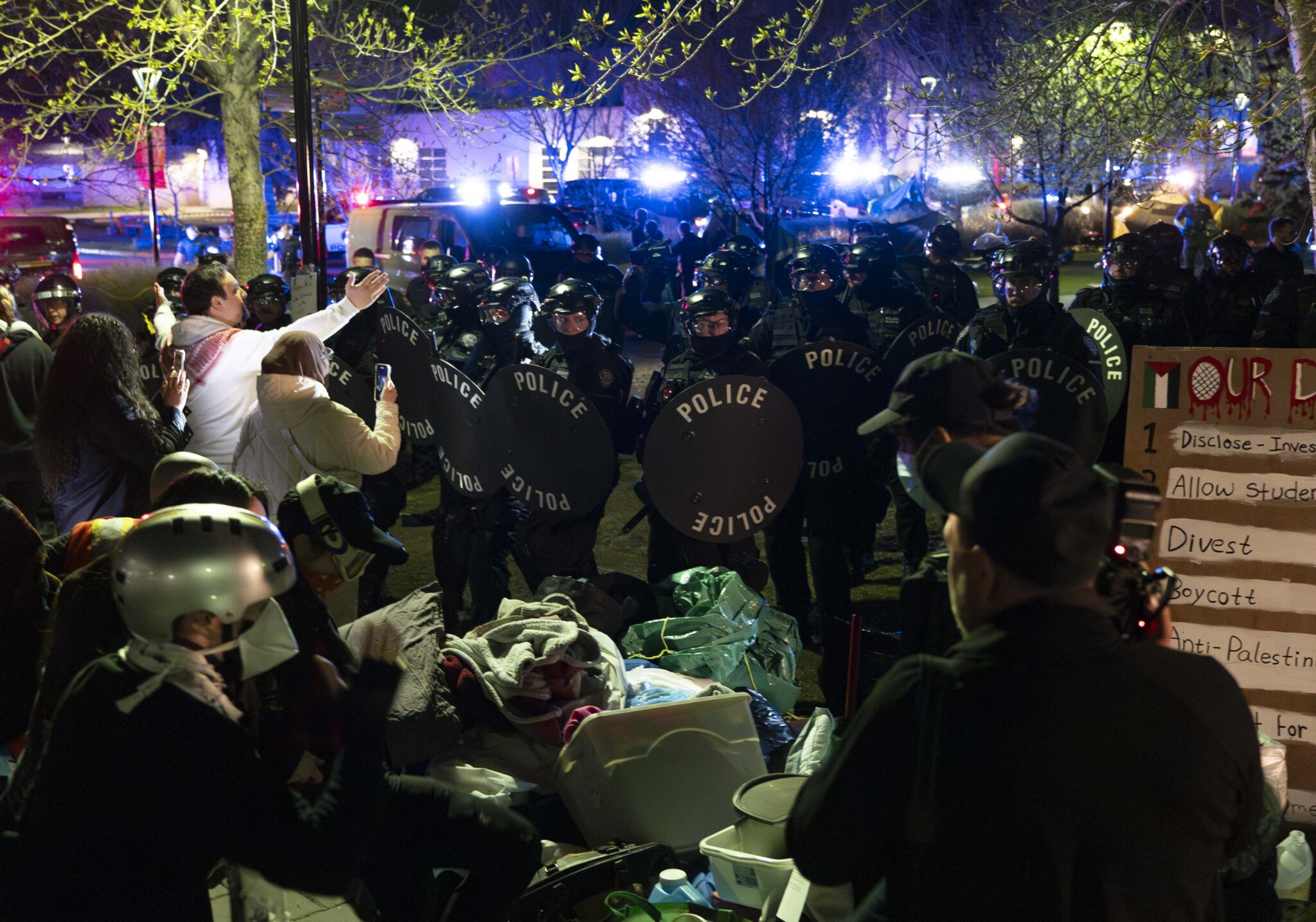 Pro-Palestine protesters confront police as they move to clear a protest encampment at the University of Calgary campus on Thursday, May 9, 2024. Noah Korver/The Canadian Press.