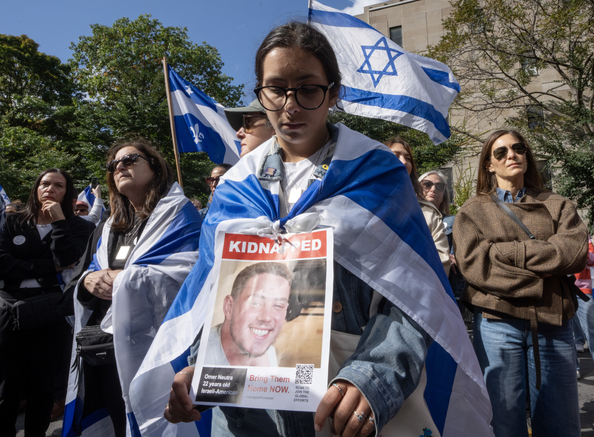 A woman holds a photo of a hostage during a pro-Israel vigil on the anniversary of a Hamas attack on Israel that triggered the ongoing war in Gaza in front of McGill University on Oct. 7, 2024. Ryan Remiorz/The Canadian Press.