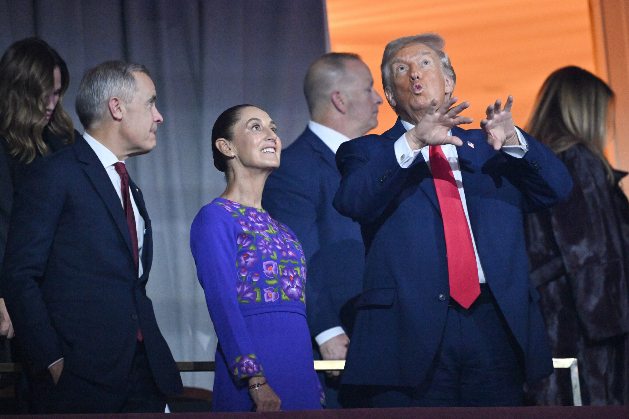 President Donald Trump speaks with Canadian Prime Minister Mark Carney and Mexican President Claudia Sheinbaum after the draw for the 2026 soccer World Cup at the Kennedy Center in Washington, Friday, Dec. 5, 2025. Mandel Ngan/Pool Photo via AP.