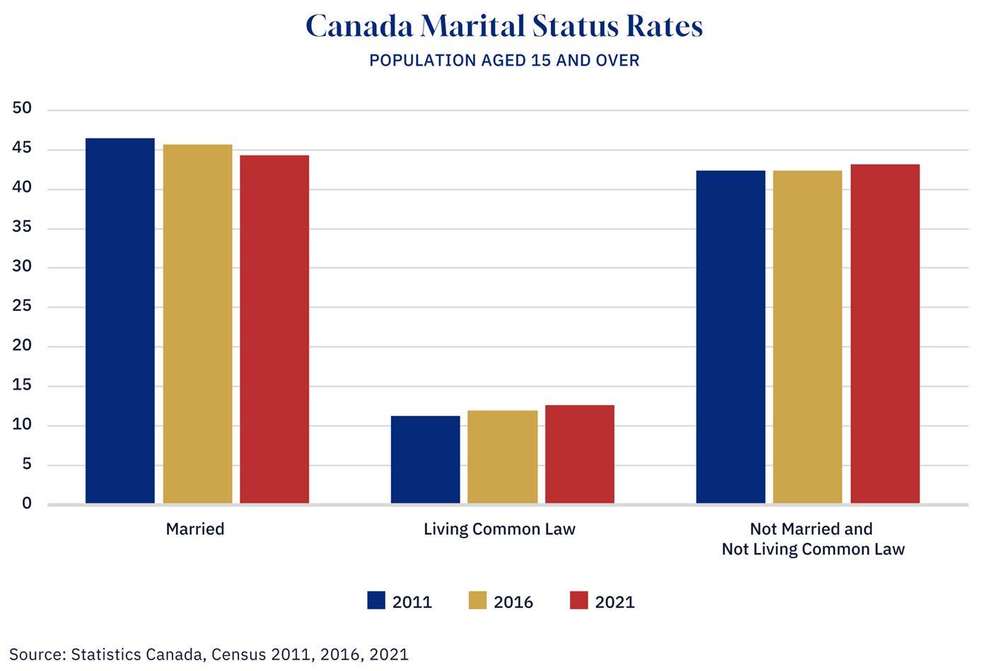 Start with marriage trends. According to the 2021 Census, a little over two-in-five Canadians are married, while about one-in-10 are living in common-law relationships. Even over the last 10 years of data, marriage rates declined by two percentage points.