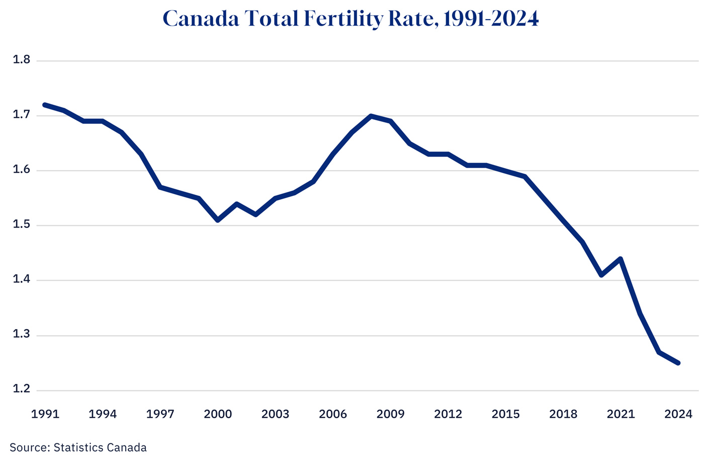 Moreover, childbearing itself has changed dramatically. Canada’s total fertility rate recently fell to 1.25 children per woman—the lowest in the last 30 years and well below the replacement level of 2.1.