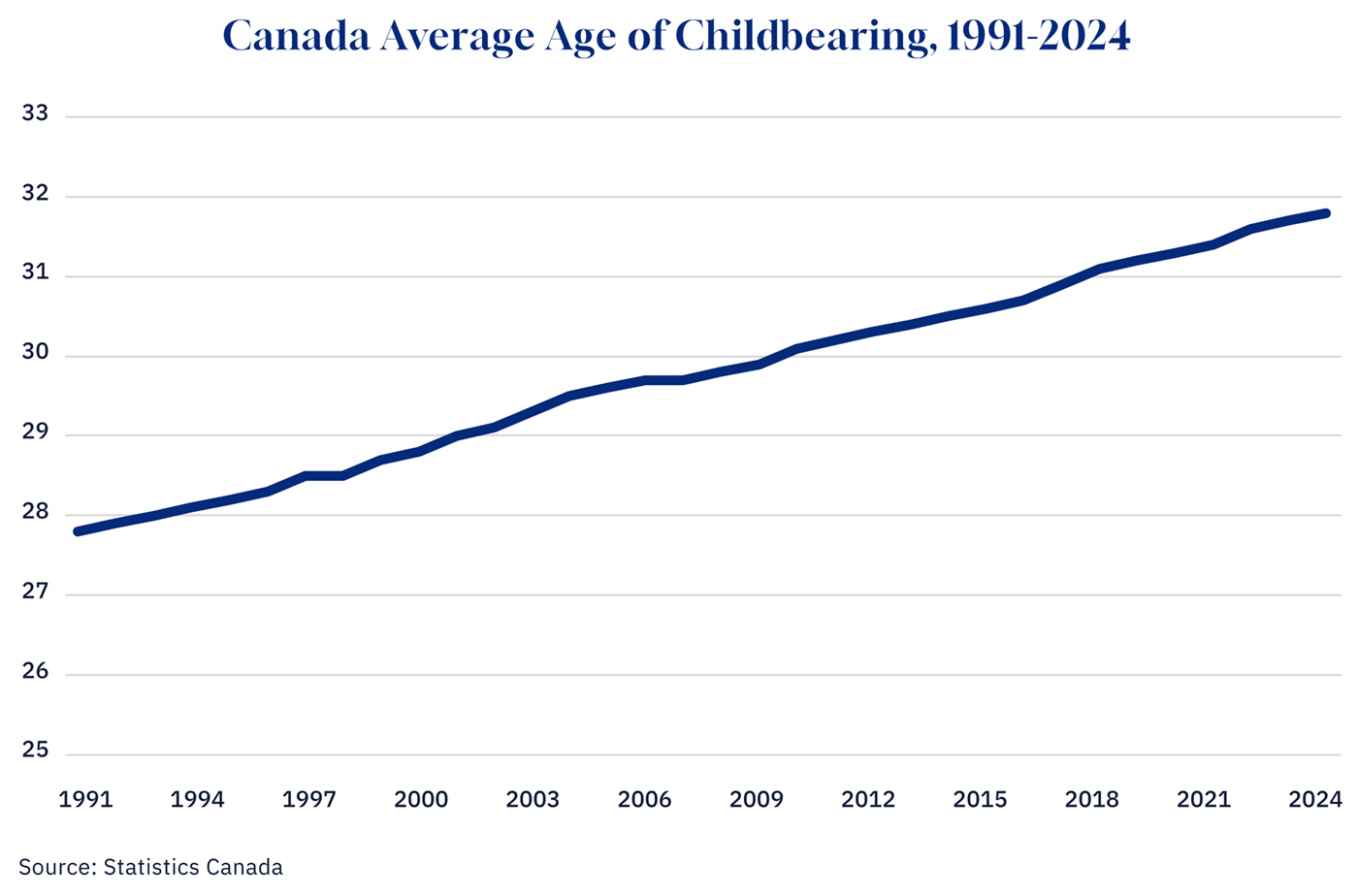 At the same time, Canadians are having children later in life. The average age of mothers at childbirth is now almost 32, up from 28 in 1991.