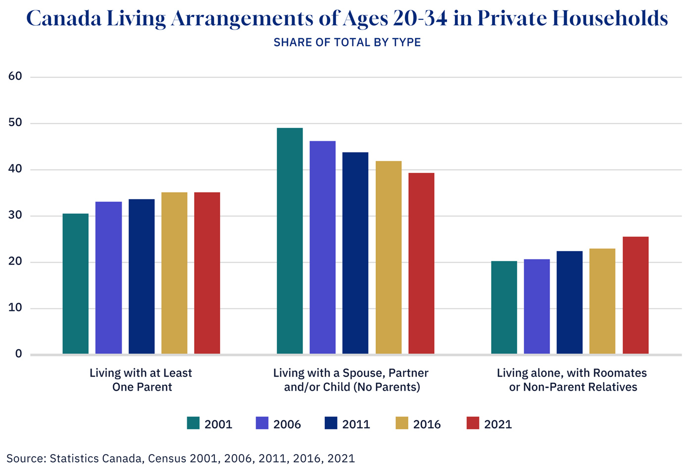 Living arrangements tell a related story. Roughly 35 percent of Canadians aged 20 to 34 lived with at least one parent in 2021. Meanwhile, the share of 20 to 34 year olds living with a spouse, partner and/or child without their parents has declined from almost 50 percent in 2001 to under 40 percent in 2021.