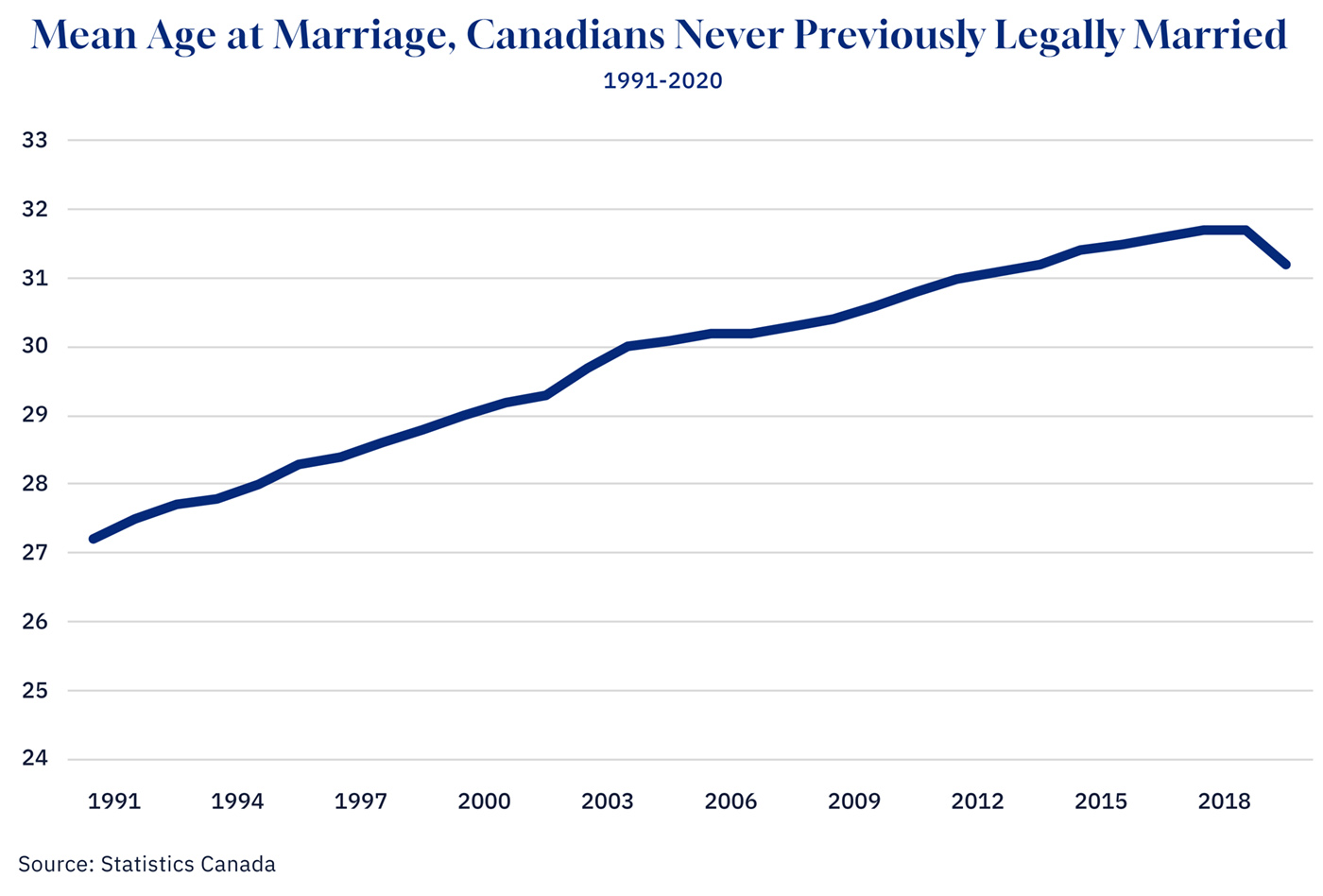 Statistics Canada has documented that family formation has slowed. Fewer young adults are marrying, and when they do, they marry later. The mean age at marriage for Canadians who were never previously married rose by four years between 1991 and 2020. At the same time, labour-force pressures and long working hours continue to shape how families experience daily life.