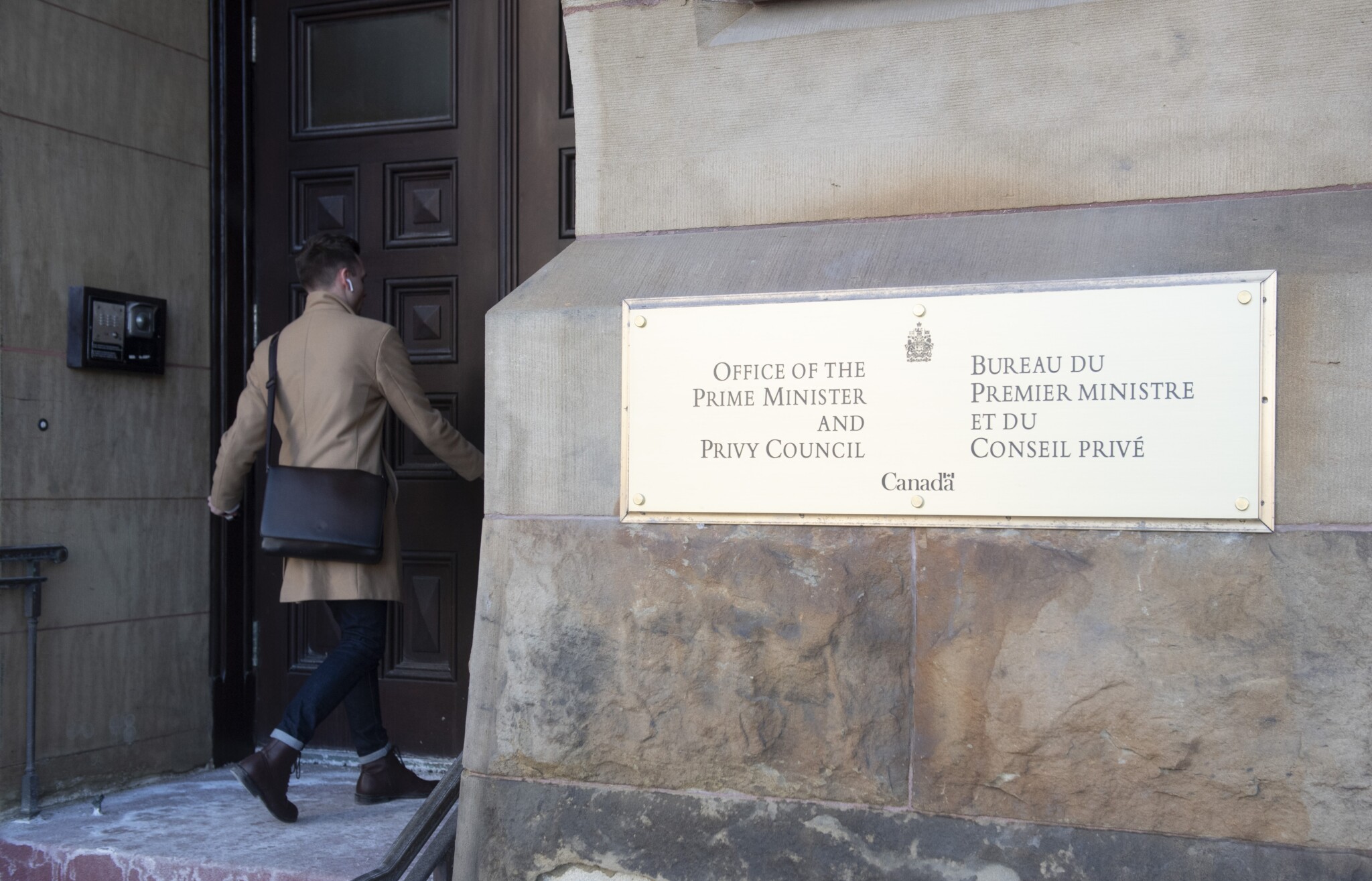 An employee arrives at the Office of the Prime Minister and Privy Council building in Ottawa, February 17, 2020. Adrian Wyld/The Canadian Press.