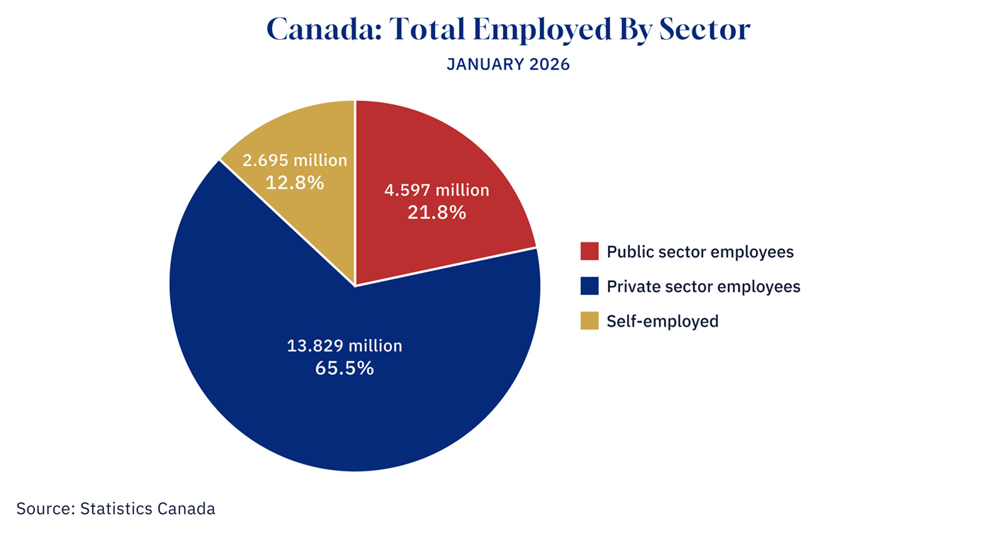But buried several tables into the same release is a figure that deserves considerably more attention. In January 2026, 4.597 million Canadians worked in the public sector—all employees of federal, provincial, and local governments, government agencies, Crown corporations, and publicly funded establishments like schools, universities, and hospitals.