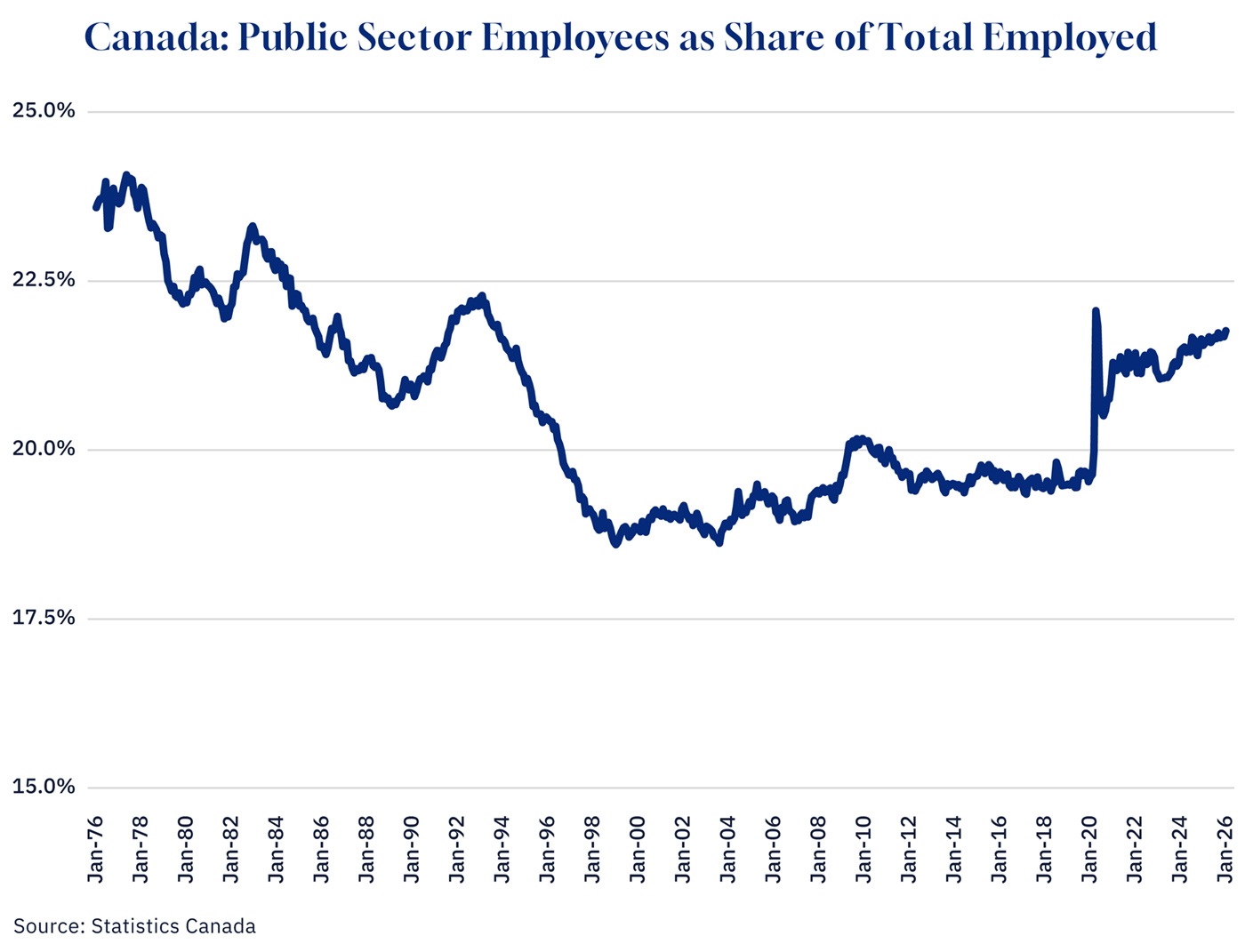 What was not expected was what came after. As private sector employment recovered, the public sector share did not return to its pre-pandemic level. Instead, it consolidated at a new, higher plateau. By January 2021, the share had settled at 21.3 percent. It has remained above 21 percent ever since. In January 2026, it stands at 21.8 percent—and if the five-year trend line continues, Canada will return to the 22-plus percent territory last seen in the early 1990s, just before governments decided that level of public sector employment was fiscally unsustainable.