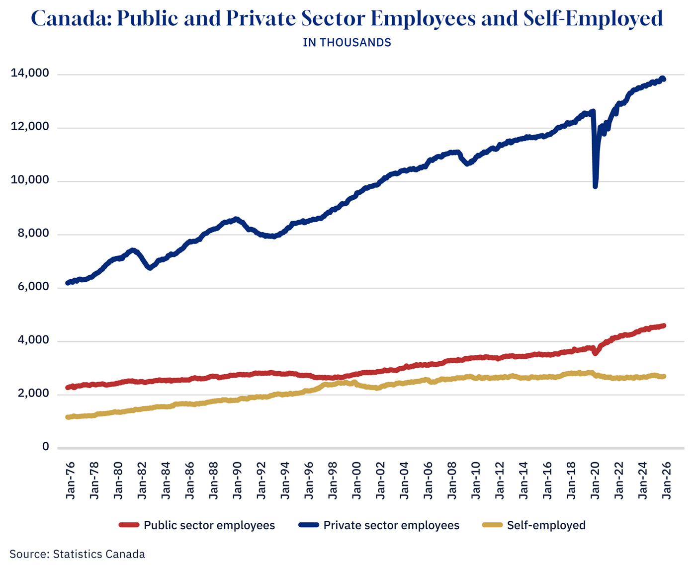 The long view puts the current trend into perspective. When Statistics Canada began tracking employment by class of worker on a monthly basis, public sector employees accounted for roughly 23 to 24 percent of Canada’s workforce—nearly one in four employed Canadians. Through the late 1970s and into the 1980s, that share generally declined. Then came the recession of the early 1990s.