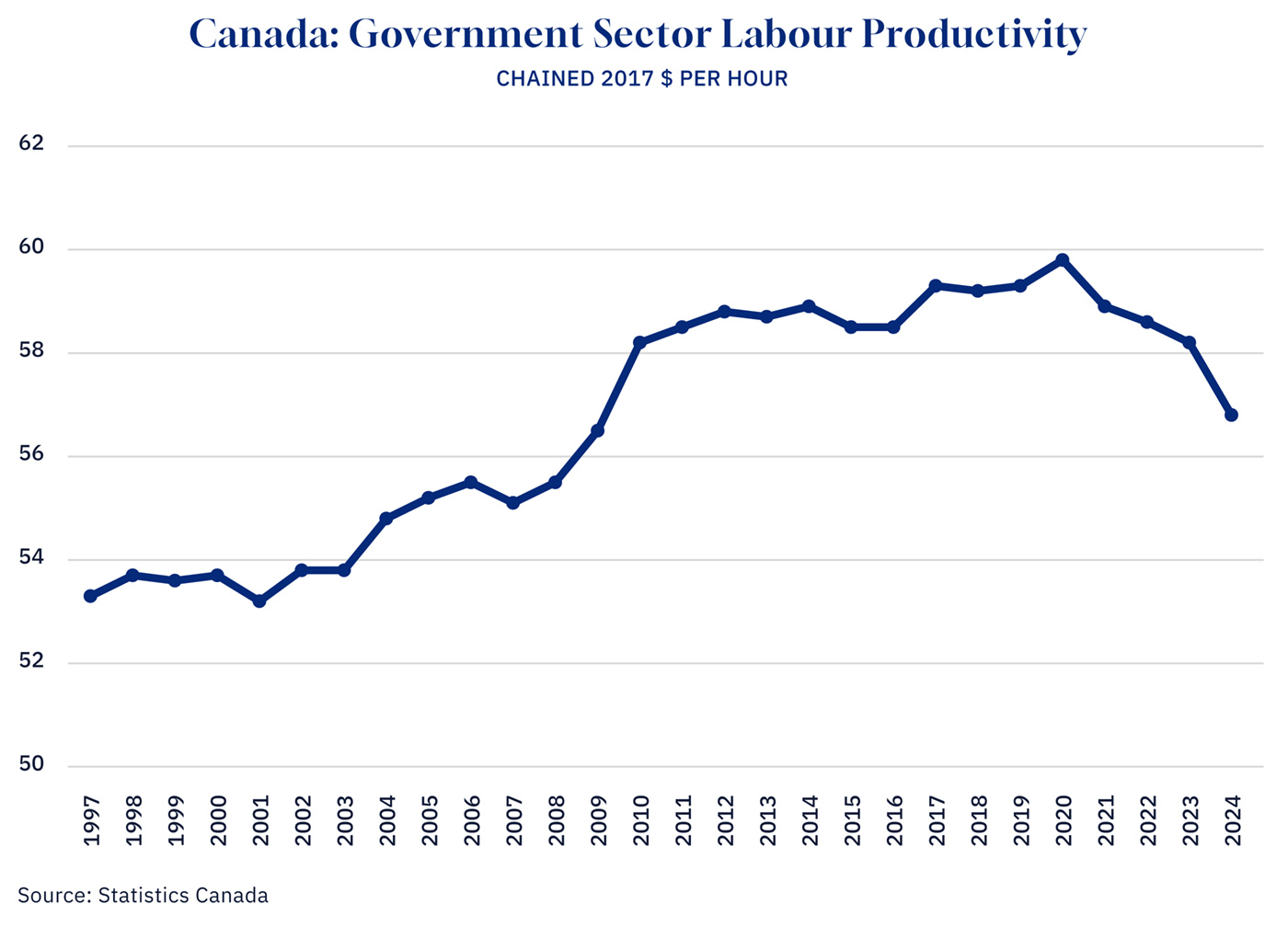There is another important dimension to this story. Statistics Canada’s labour productivity data for the government sector show that inflation-adjusted output per hour worked in government peaked at $59.80 (in 2017 dollars) and has declined every year since, falling to $56.80 in 2024. That is the lowest reading since 2009, and it comes as public sector employment has been growing.