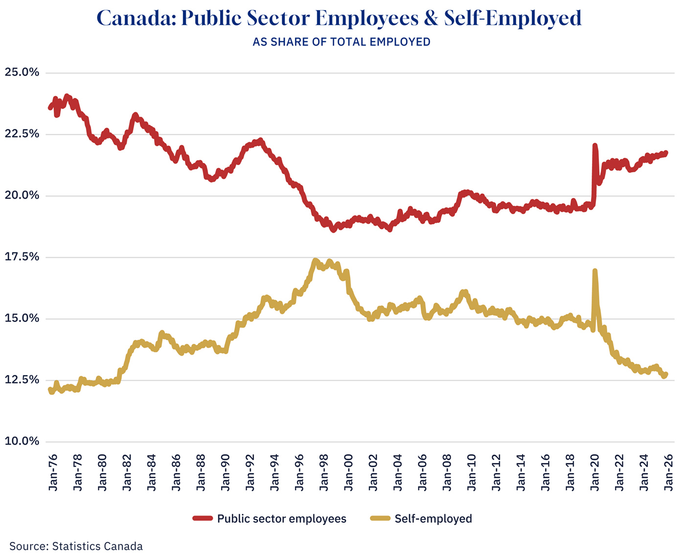 The productivity problem connects to a broader reallocation of Canada’s workforce that receives almost no attention. As the public sector has grown as a share of employment, self-employment has moved in the opposite direction—and the inverse correlation is striking when viewed over the same 50-year horizon.