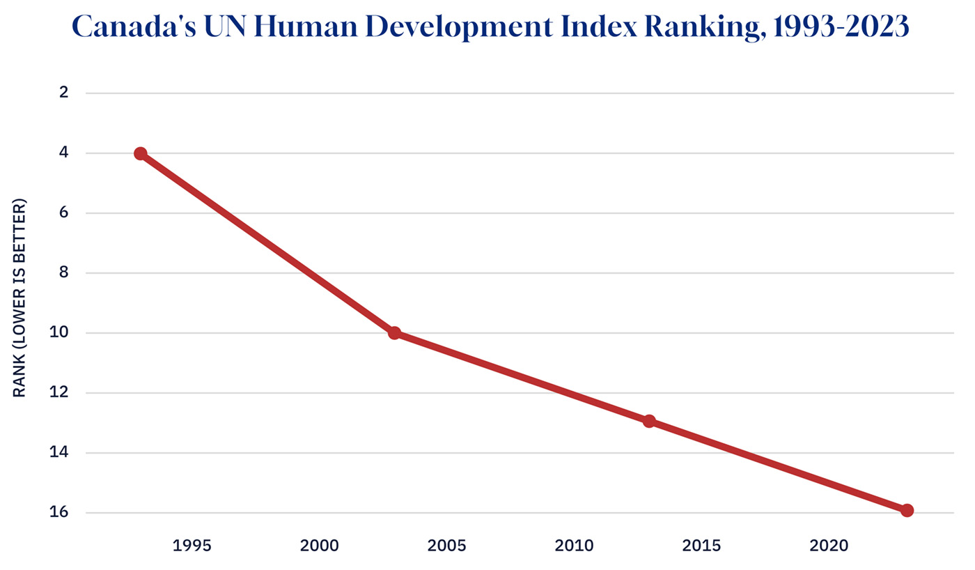 The most well-known approach to constructing a more fulsome quality-of-life index is the United Nations’ Human Development Index (HDI). First published in 1990, the HDI assesses performance across a variety of criteria, including life expectancy, and assigns countries a score between 0 and 1. In 1993, Canada ranked fourth in the world; in the 1990s, it routinely ranked in the top five. Over the next two decades, Canada continued to improve in absolute terms, gaining 0.031 and 0.028 points respectively, but our rankings fell to 10th in 2003 and 13th in 2013.
