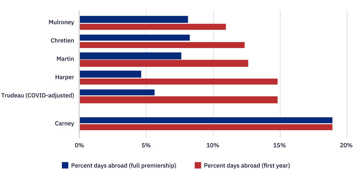 Carney has now spent 68 days travelling abroad—about 20 percent of his first year in office. Jean Chretien, who made long “Team Canada” trade visits a cornerstone of his foreign policy, spent about 8 percent of his premiership abroad; Stephen Harper, for whom “three days is a long trip,” spent less than 5 percent of his time as prime minister outside Canada. Some variation is to be expected between leaders as Canadian diplomacy changed and prime ministers increasingly spent more time at international summits. But Carney’s 19 percent figure is a huge outlier, even when accounting for busier-than-normal first-year schedules.