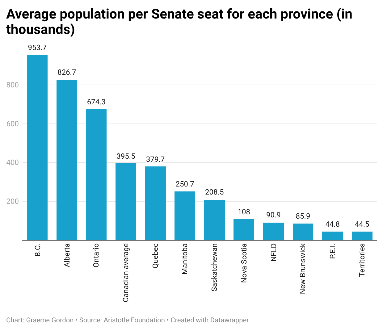 The disparities in representation in the Senate have become more pronounced over the years: P.E.I. has one senator for every 43,082 residents compared to Alberta’s one for every 826,683 people, i.e. 19 times more representation in proportion to its population. B.C meanwhile has one senator for every 953,720 people. Ontario’s representation doesn’t fare much better, with one senate seat for every 674,277 people.