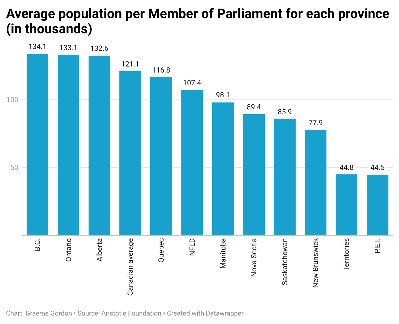 P.E.I. has one MP or seat in Parliament for every 44,748 residents, while Alberta has one for every 132,645 people—almost three times as many constituents per elected representative. Representation is even more diluted for Ontario (133,077 people on average per riding) and B.C. (134,057).