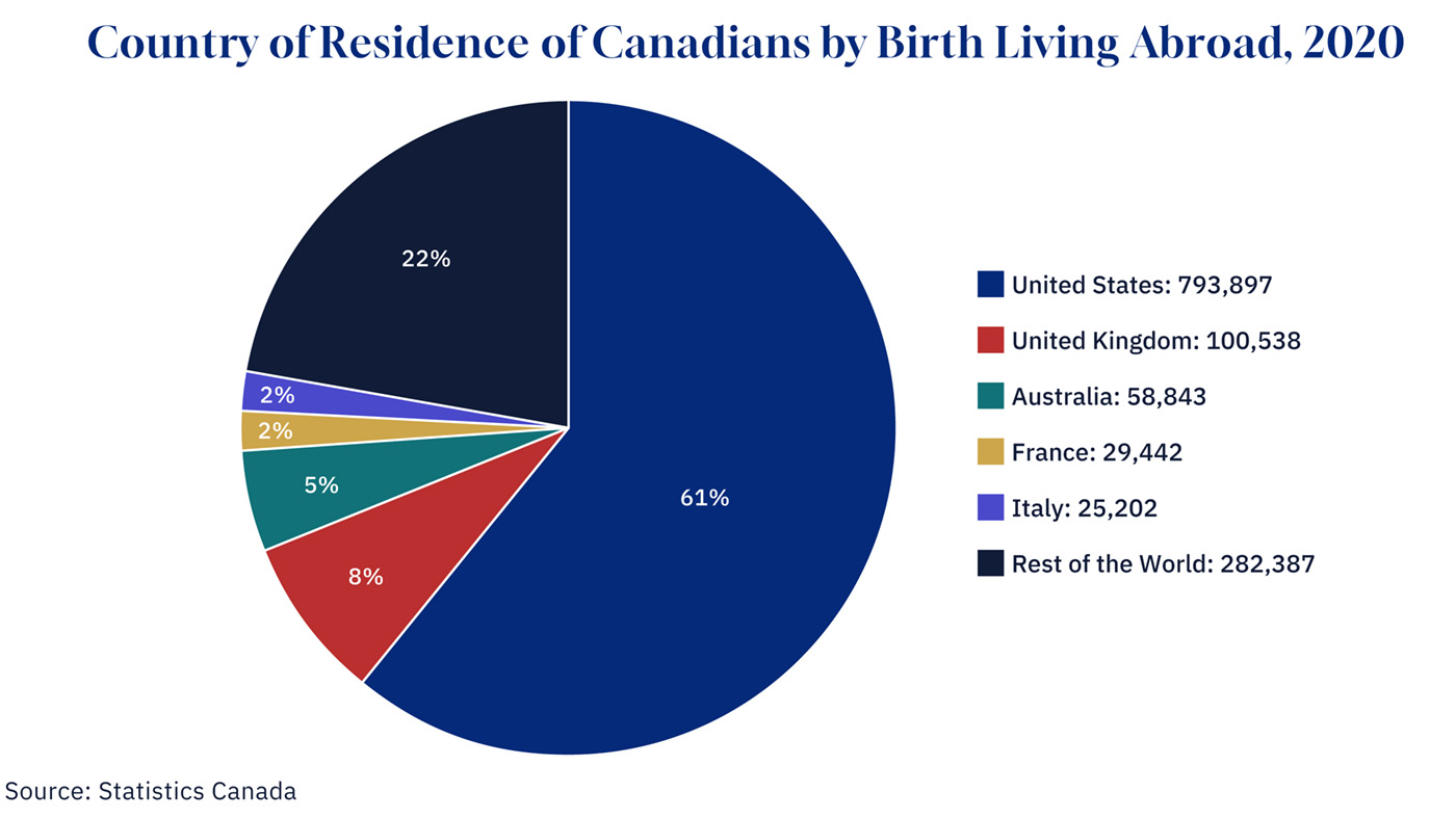 Among the 1.3 million Canadians by birth living abroad, the United States dominates as the destination of choice. In 2020, 793,897 or 61.4 percent of them resided in the United States. The next largest destinations were the United Kingdom (7.8 percent), Australia (4.6 percent), France (2.3 percent), and Italy (2.0 percent).