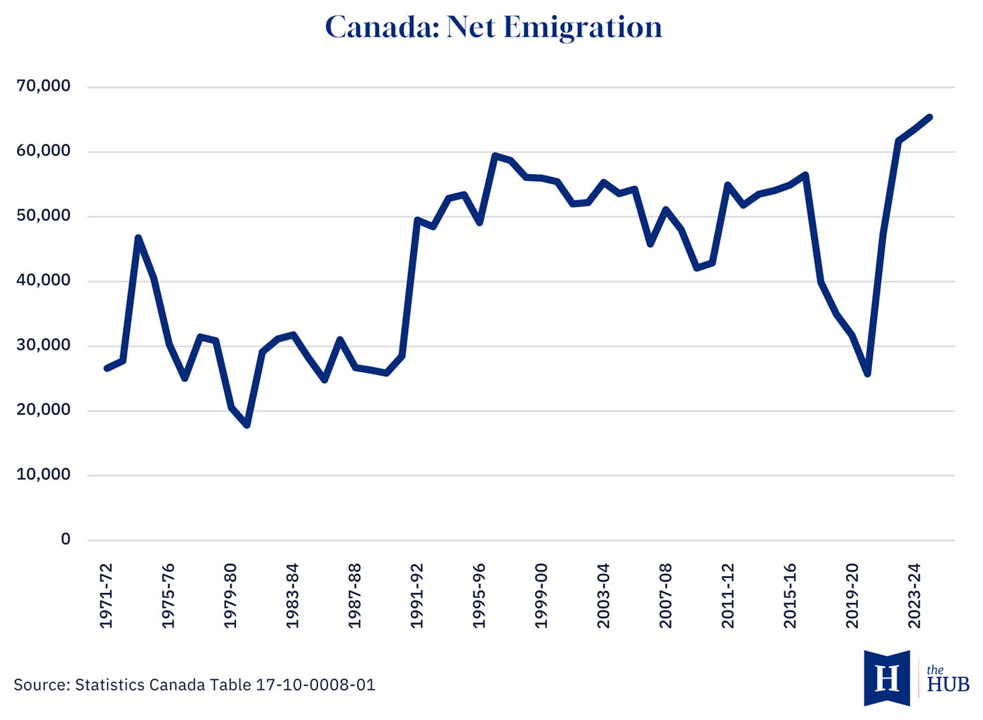 Canadian net emigration—a series Statistics Canada maintains for long-term consistency due to methodological changes to the gross numbers—reached 65,372 in 2024-25, the highest level in the 50-year data series. Whether this represents catch-up from pandemic travel restrictions or a genuine new trend remains unclear.