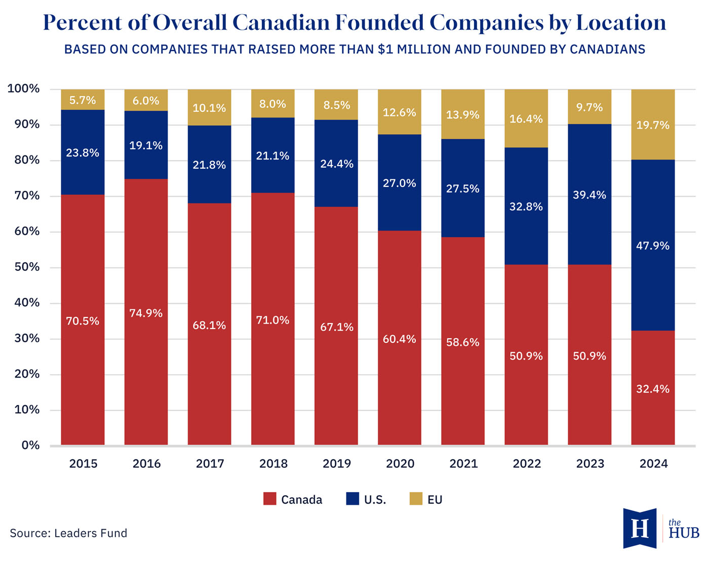 The pattern extends to entrepreneurship. Leaders Fund research analyzing nearly 3,000 venture-backed startups founded by Canadians between 2015 and 2024 found the U.S. went from producing 11 times more high-potential startups than Canada in 2015 to 45 times more in 2024. Nearly half of Canadian founders who raised over $1 million in 2024 were based in the U.S., versus one-third based in Canada, and the U.S. share has steadily grown since 2018. Canadian founders operating south of the border raise nearly twice as much capital as those who stay.